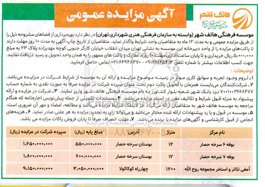 موسسه فرهنگی هاتف شهر وابسته به سازمان فرهنگی هنری شهرداری تهران در نظر دارد بهره برداری از فضاهای مشروحه ذیل را از طریق مزایده عمومی و به مدت 12 ماه به متقاضیان واجد شرایط واگذار نماید. متقاضیان از تاریخ چاپ آگهی به مدت 10 روز مهلت دارند تا پاکتهای مزایده را از واحد دبیرخانه این موسسه به نشانی تهران میدان انقلاب خیابان کارگر جنوبی کوچه مهدیزاده پلاک 23 به مبلغ 5.000.000 ریال خریداری و تا پایان ساعت اداری مهلت 10 روزه مدارک و پاکتهای ممهور را به همان واحد تحویل و رسید دریافت نمایند.