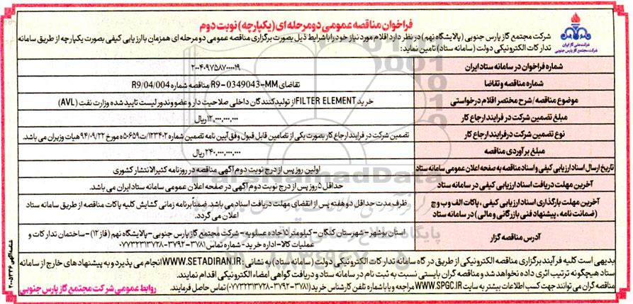 مناقصه خرید FILTER ELEMENT ...- نوبت دوم از کلیه افراد متخصص و شرکتها واجد شرایط دعوت به عمل میآید در مناقصه با کد خبرگزاری پارس نماد: 9583019 شرکت نمایند.