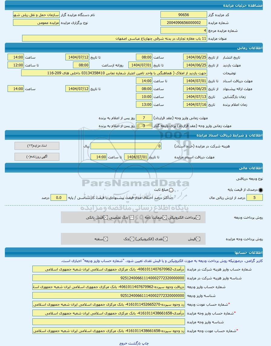 مزایده عمومی مزایده 11 باب مغازه تجاری در بدنه شرقی چهارباغ عباسی اصفهان -مزایده واحد تجاری - استان اصفهان برگزار میگردد. از کلیه افراد متخصص و شرکت‌های واجد شرایط دعوت به عمل می‌آید تا در این مزایده با کد خبرگزاری پارس نماد : 9583069 شرکت نمایند تاریخ شروع مزایده : 1404/06/25 مهلت شرکت در مزایده: تا پایان روز 1404/07/01 مکان برگزاری اموال واگذاری استان‌های اصفهان و دسته‌بندی‌های مربوط به این حراجی واگذاری ورزشگاه، پارکینگ، غرفه و بوفه میباشد. اطلاعات دقیق‌تر درباره شرایط شرکت در مزایده آنلاین و نحوه ارسال مدارک، الزامات پروژه و دریافت اسناد مزایده و تاریخ بازگشایی پاکت‌ها، در بخش اطلاعات تکمیلی این آگهی درج شده است.