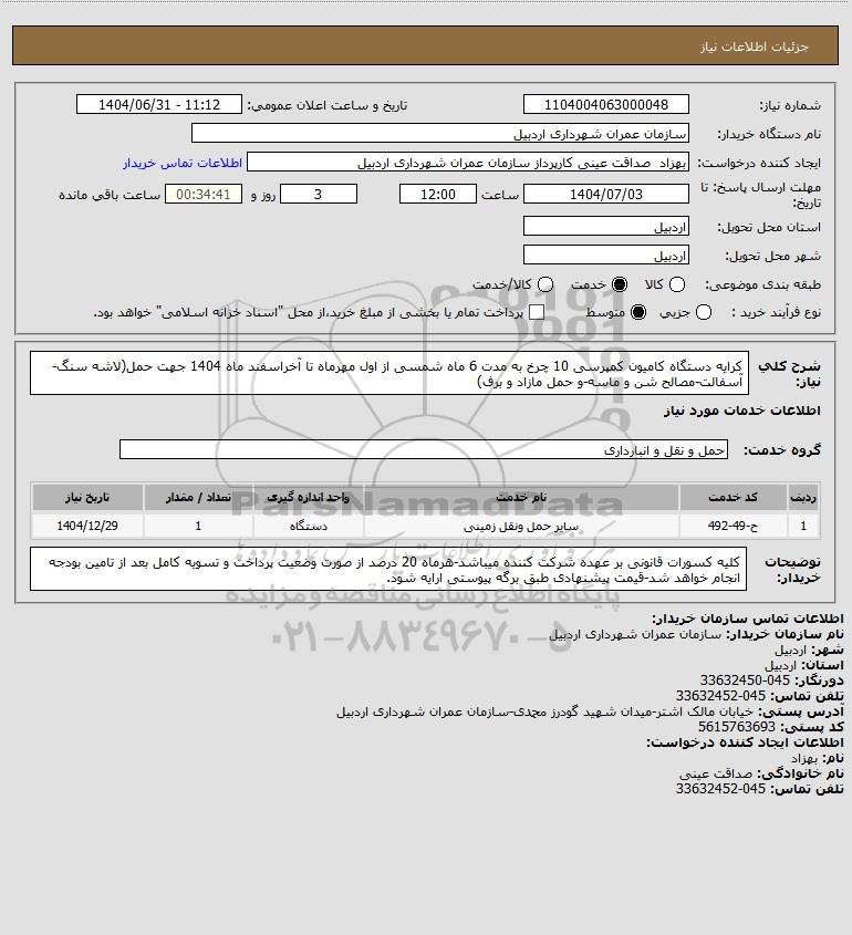 شرح کلی نیاز: کرایه دستگاه کامیون کمپرسی 10 چرخ به مدت 6 ماه شمسی از اول مهرماه تا آخراسفند ماه 1404 جهت حمل(لاشه سنگ-آسفالت-مصالح شن و ماسه-و حمل مازاد و برف)