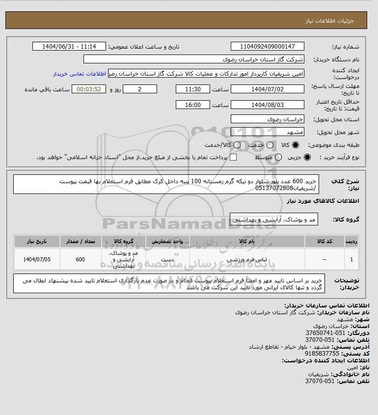 شرح کلی نیاز: خرید 600 عدد بلوز شلوار دو تیکه گرم زمستانه 100 پنبه داخل کرک مطابق فرم استعلام بها قیمت پیوست /شریفیان05137072808