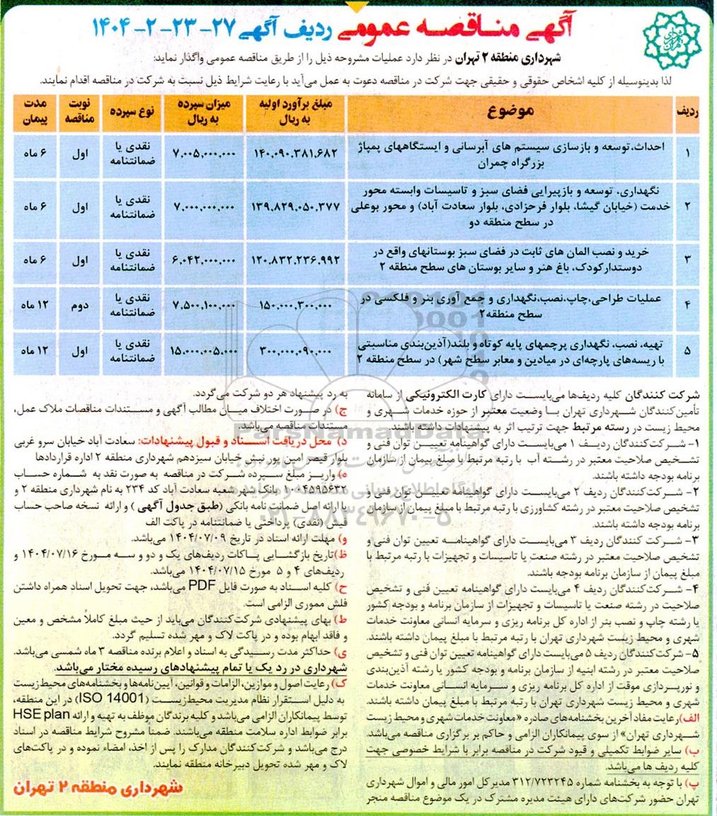 شهرداری منطقه 2 تهران در نظر دارد عملیات مشروحه ذیل را از طریق مناقصه عمومی واگذار نماید.
