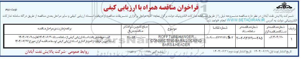 فراخوان مناقصه ROFF TUBE HANGER CONNECTING BAR & LOCKING BARS & HEADER- نوبت دوم از کلیه افراد متخصص و شرکتها واجد شرایط دعوت به عمل میآید در مناقصه با کد خبرگزاری پارس نماد: 9584142 شرکت نمایند.