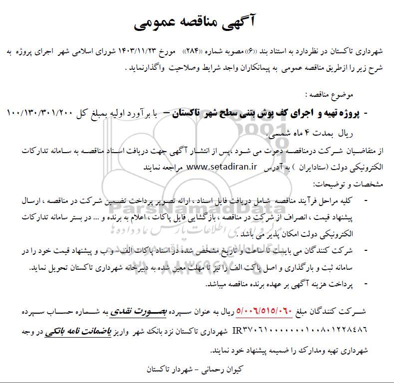 - پروژه تهیه و اجرای کف پوش بتنی سطح شهر تاکستان - با برآورد اولیه بمبلغ كل 100.130.301.200 ريال بمدت 4 ماه شمسی