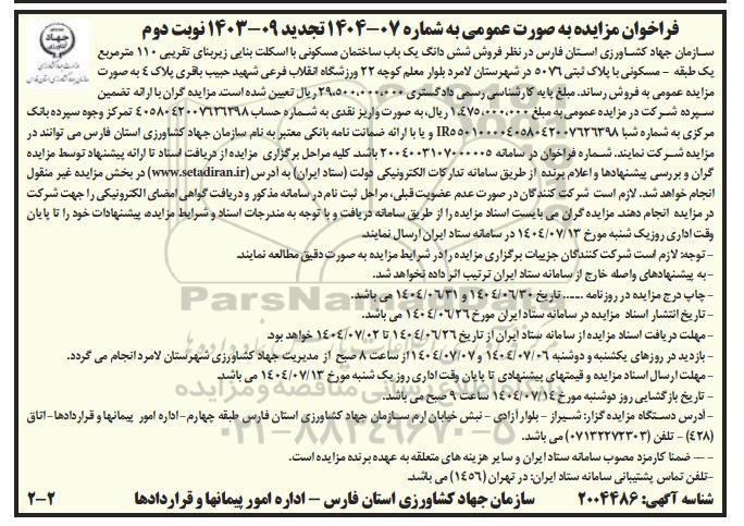 سازمان جهاد کشاورزی استان فارس در نظر دارد فروش ششدانگ یک باب ساختمان مسکونی با اسکلت بنایی زیربنای تقریبی 110 مترمربع یک طبقه مسکونی با پلاک ثبتی 5076 در شهرستان لامرد بلوار معلم کوچه 22 ورزشگاه انقلاب فرعی شهید حبیب باقری پلاک 4