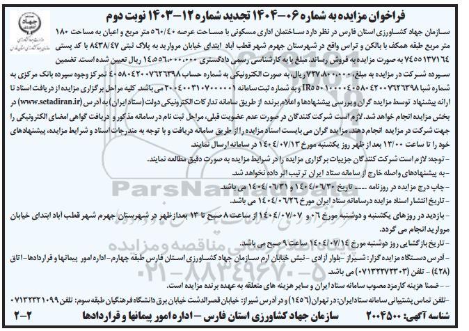 سازمان جهاد کشاورزی استان فارس در نظر دارد ساختمان اداری مسکونی با مساحت عرصه 560/40 متر مربع و اعیان به مساحت 180 متر مربع طبقه همکف با بالکن و تراس واقع در شهرستان جهرم شهر قطب آباد ابتدای خیابان مروارید به پلاک ثبتی 8438/47 با کد پستی 7455137164 بصورت مزایده به فروش رساند . مبلغ پایه کارشناسی رسمی دادگستری 14.556.000.000 ریال تعیین شده است . تضمین سپرده شرکت در مزایده به مبلغ 727.800.000 ریال، بصورت الکترونیکی به شماره حساب 4058042007626398 تمرکز وجوه سپرده بانک مرکزی به شماره شبا IR550100004058042007626398 و به شماره ثبت سامانه 2004003107000001 می باشد . کلیه مراحل برگزاری مزایده از دریافت اسناد تا ارائه پیشنهاد توسط مزایده گران و بررسی پیشنهادها و اعلام برنده از طریق سامانه تدارکات الکترونیکی دولت ستاد (ایران) به آدرس سایت ستاد در بخش مزایده انجام خواهد شد. لازم است شرکت کنندگان در صورت عدم عضویت قبلی، مراحل ثبت نام در سامانه مذکور و دریافت گواهی امضای الکترونیکی را جهت شرکت در مزایده انجام دهند. مزایده گران میبایست اسناد مزایده را از طریق سامانه دریافت و با توجه به مندرجات اسناد و شرایط مزایده، پیشنهادهای خود را تا ساعت 13:00 بعد از ظهر روز یکشنبه مورخ 1404.7.13 در سامانه ارسال نمایند.