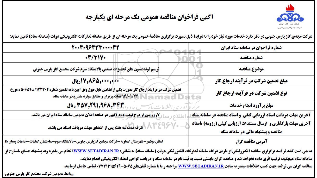 شرکت مجتمع گاز پارس جنوبی در نظر دارد خدمات مورد نیاز خود را با شرایط ذیل به صورت برگزاری مناقصه عمومی یک مرحله ای از طریق سامانه تدارکات الکترونیکی دولت (سامانه ستاد) تامین نماید: