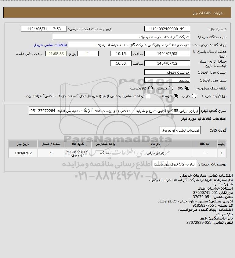شرح کلی نیاز: ژنراتور دیزلی 55 کاوا (طبق شرح و شرایط استعلام بها و پیوست های آن)/آقای مهندس املیه: 37072284-051