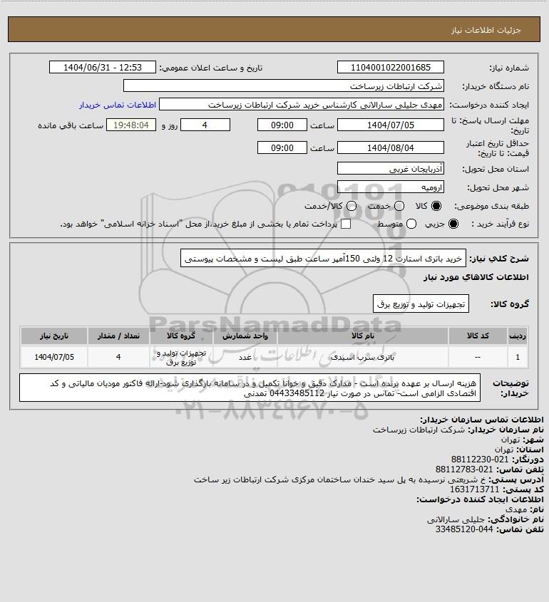 شرح کلی نیاز: خرید باتری استارت 12 ولتی 150آمپر ساعت طبق لیست و مشخصات پیوستی