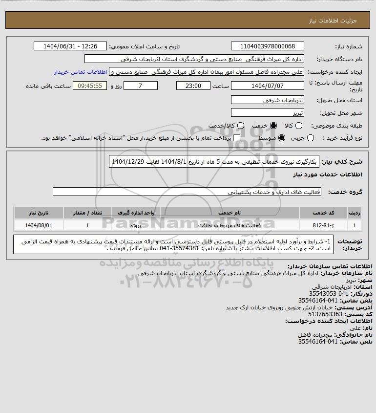 شرح کلی نیاز: بکارگیری نیروی خدمات تنظیفی به مدت 5 ماه از تاریخ 1404/8/1 لغایت 1404/12/29