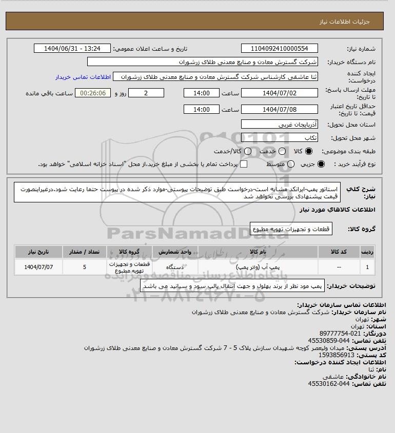 نام دستگاه خریدار:شرکت گسترش معادن و صنایع معدنی طلای زرشوران
