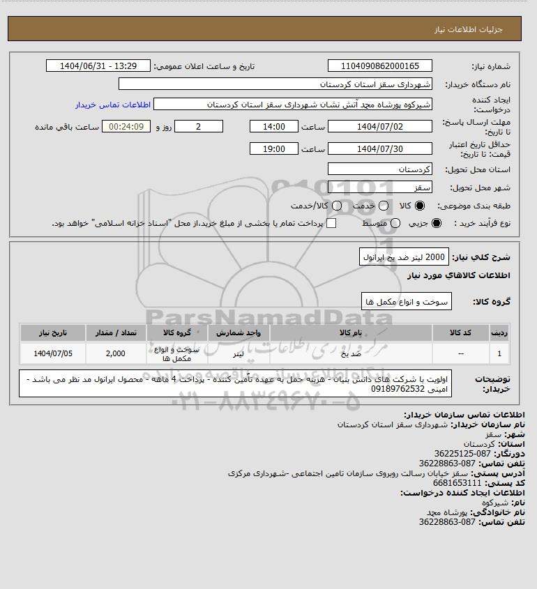 شرح کلی نیاز: 2000 لیتر ضد یخ ایرانول