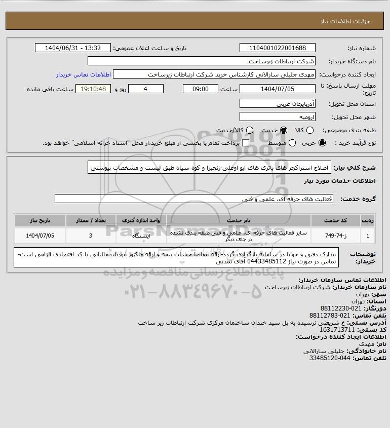 شرح کلی نیاز: اصلاح استراکچر های باتری های ایو اوغلی-زنجیرا و کوه سیاه طبق لیست و مشخصات پیوستی