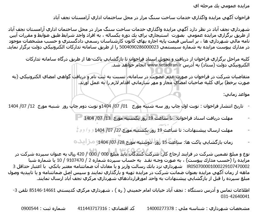 شهرداری نجف آباد در نظر دارد آگهی مزایده واگذاری خدمات ساخت سنگ مزار در محل ساختمان اداری آرامستان نجف آباد از طریق برگزاری مزایده عمومی بصورت استیجاری برای یک دوره یکساله ، به افراد واجد شرایط طبق ضوابط و مقررات آیین نامه مالی شهرداری ها ، بر اساس قیمت پایه اجاره بهای کانون کارشناسان رسمی دادگستری و حسب مشخصات موجود در مدارک پیوست مزایده به شماره سیستمی 5004090286000023 را از طریق سامانه تدارکات الکترونیکی دولت برگزار نماید.