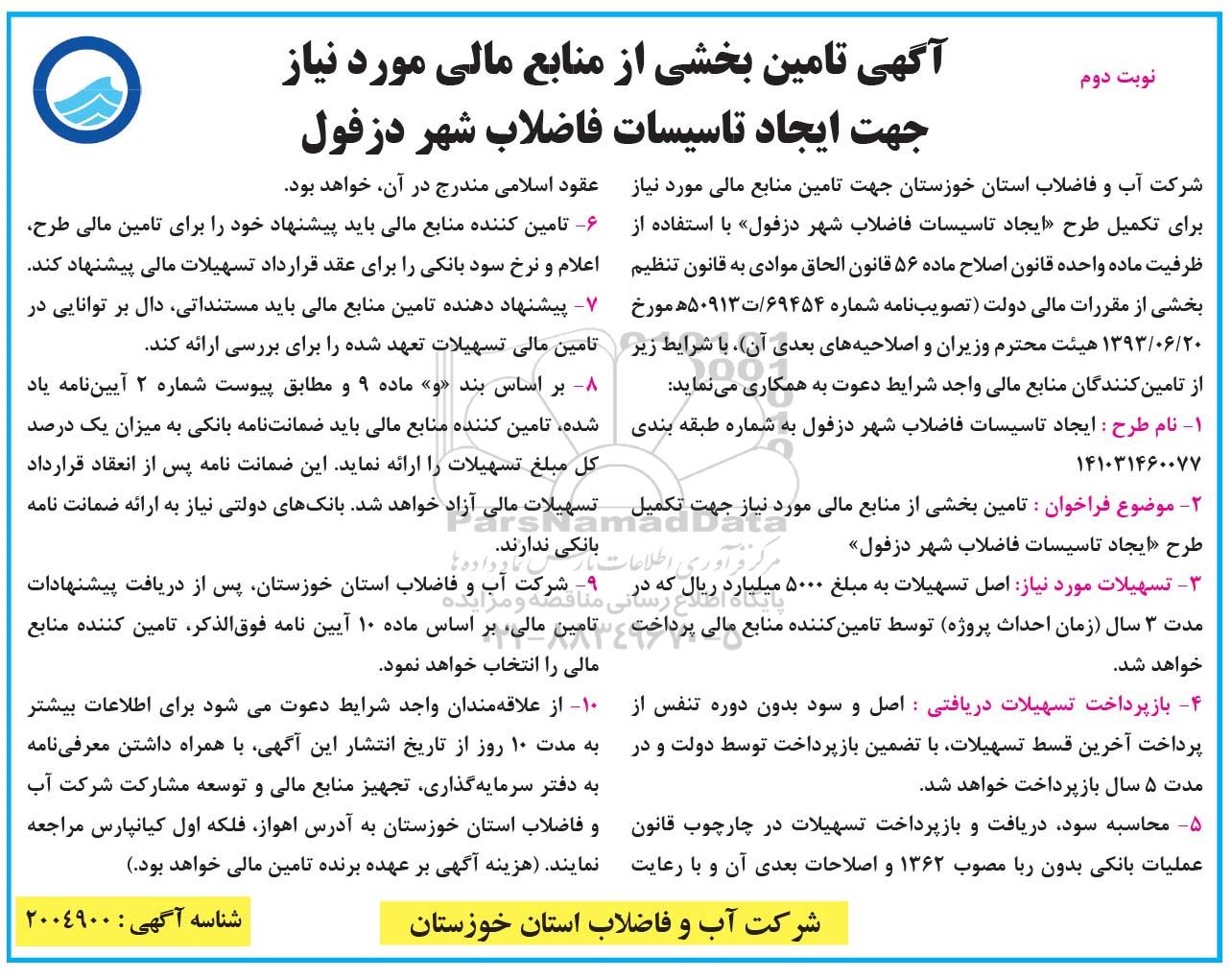 شرکت آب و فاضلاب استان خوزستان جهت تامین منابع مالی مورد نیاز برای تکمیل طرح "ایجاد تاسیسات فاضلاب شهر دزفول " با استفاده از ظرفیت ماده واحده قانون اصلاح ماده 56 قانون الحاق موادی به قانون تنظیم بخشی از مقررات مالی دولت (تصویب نامه شماره 69454 /ت 550913 مورخ 1393.06.20 هیئت محترم وزیران و اصلاحیه های بعدی آن ) با شرایط زیر از تامین کنندگان منابع مالی واجد شرایط دعوت به همکاری می نماید: