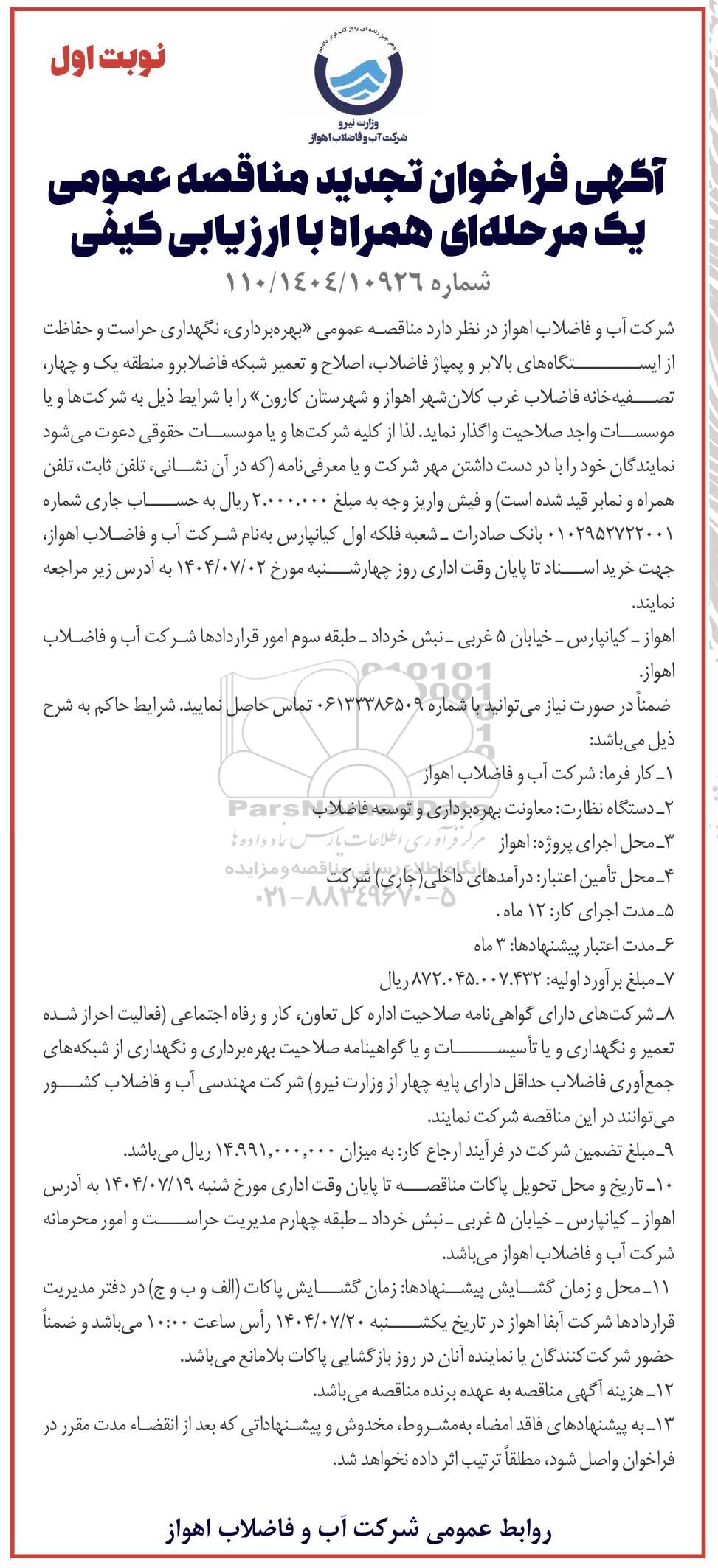 شرکت آب و فاضلاب اهواز در نظر دارد مناقصه عمومی بهره برداری، نگهداری ، حراست و حفاظت از ایستگاههای بالابر و پمپاژ فاضلاب، اصلاح و تعمیر شبکه فاضلابرو منطقه یک و چهار، تصفیه خانه فاضلاب غرب کلان شهر اهواز و شهرستان کارون را با شرایط ذیل به شرکتها و یا موسسات واجد صلاحیت واگذار نماید. لذا از کلیه شرکتها و یا موسسات حقوقی دعوت میشود ، نمایندگان خود را با در دست داشتن مهر شرکت و یا معرفی نامه که در آن نشانی تلفن ثابت تلفن همراه و نمابر قید شده است و فیش واریز وجه به مبلغ 2.000.000 ریال به حساب جاری شماره 0102952722001 بانک صادرات شعبه فلکه اول کیانپارس به نام شرکت آب و فاضلاب اهواز جهت خرید اسناد تا پایان وقت اداری روز 4شنبه مورخ 1404.7.2 به آدرس زیر مراجعه نمایند.