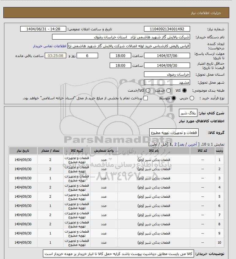 | 9 | -- | قطعات یدکی شیر (ولو) | عدد | قطعات و تجهیزات تهویه مطبوع | 1 | 1404/09/30 |