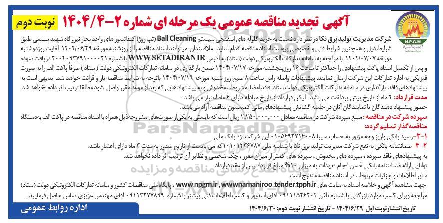 شرکت مدیریت تولید برق نکا در نظر دارد نسبت به خرید گلوله های اسفنجی سیستم Ball Cleaning (تپ روژ )کندانسورهای واحد بخار نیروگاه شهید سلیمی طبق شرایط ذیل و همچنین شرایط فنی و خصوصی پیوست اسناد مناقصه اقدام نماید. علاقه مندان میتوانند اسناد مناقصه را از روز شنبه مورخه 1404.6.29 لغایت روز دوشنبه مورخه 1404.7.7 با مراجعه به سامانه تدارکات الکترونیکی دولت (ستاد) به آدرس ستاد ایران با شماره 2004093791000021 دریافت نموده و پس از تکمیل استاد پاکت پیشنهادی را حداکثر تا ساعت 16 روز پنجشنبه مورخه 1404.7.17 ضمن بارگذاری در سامانه تدارکات الکترونیکی دولت (ستاد) صرفا پاکت الف را به صورت فیزیکی به اداره تدارکات این شرکت ارسال نمایند. پیشنهادات واصله راس ساعت 8 صبح روز شنبه مورخه 1404.7.19 با توجه به شرایط مناقصه باز و قرائت خواهد شد. بدیهی است به پیشنهادهای فاقد بارگذاری در سامانه تدارکات الکترونیکی دولت ستاد فاقد امضاء مشروط، مخدوش و به پیشنهادهایی که بعد از موعد مقرر واصل شود مطلقا ترتیب اثر داده نخواهد شد.