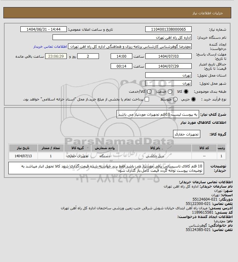 شرح کلی نیاز: به پیوست لیست 10قلم تجهیزات موردنیاز می باشد