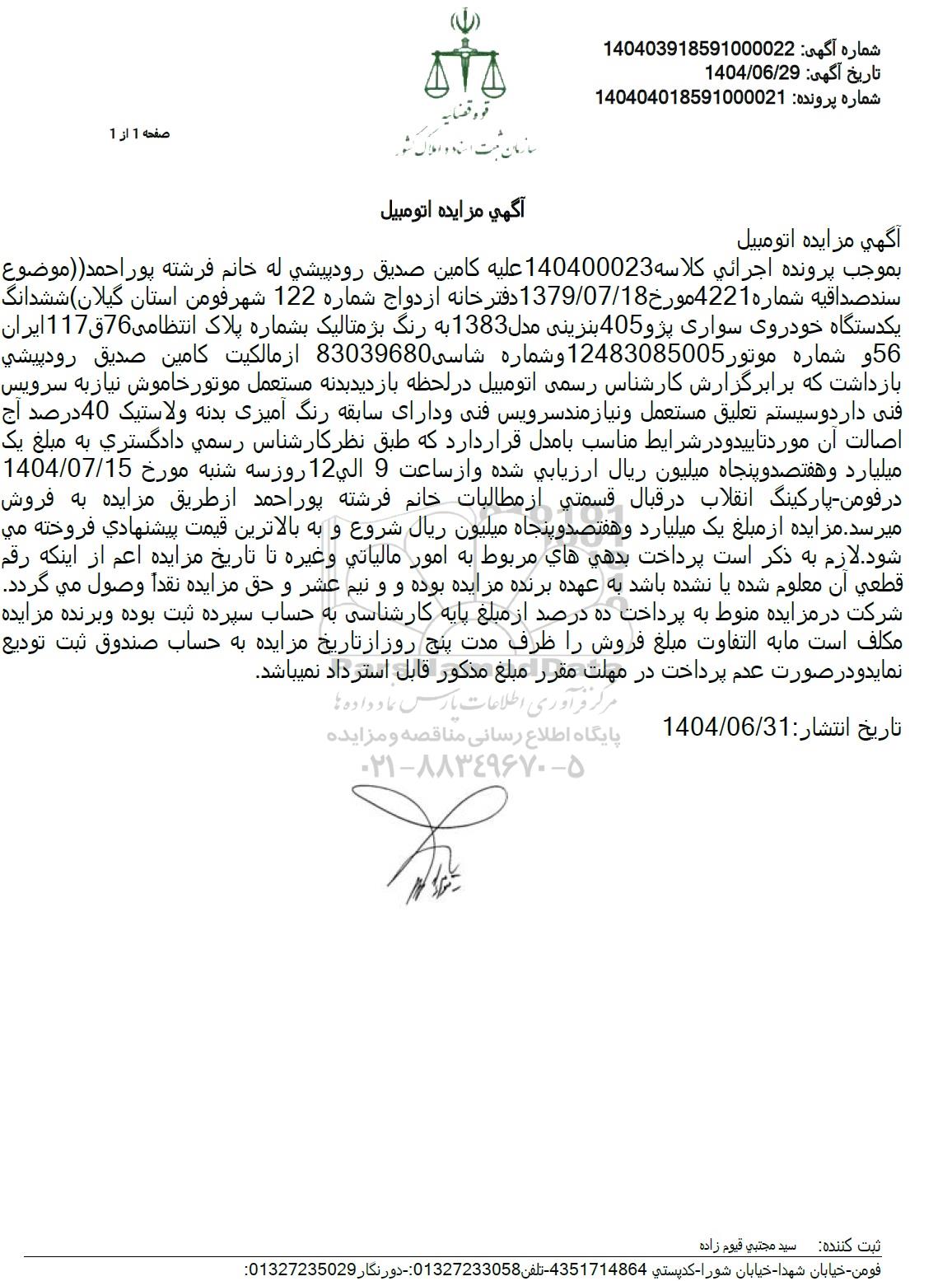 بموجب پرونده اجرائی کلاسه 140400023 عليه كامین صدیق رودپیشی له خانم فرشته پوراحمد (موضوع سند صداقیه شماره 4221 مورخ 1379.07.18 دفترخانه ازدواج شماره 122 شهر فومن استان گیلان) ششدانگ یکدستگاه خودروی سواری پژو 405 بنزینی مدل 1383 به رنگ بژ متالیک بشماره پلاک انتظامی 76 ق 117 ایران 56 و شماره موتور 12483085005 و شماره شاسی 83039680 از مالکیت کامین صديق رودپيشي بازداشت که برابرگزارش کارشناس رسمی اتومبیل در لحظه بازدید بدنه مستعمل موتور خاموش نیاز به سرویس فنی دار دو سیستم تعلیق مستعمل و نیازمند سرویس فنی و دارای سابقه رنگ آمیزی بدنه ولاستیک 40 درصد آج اصالت آن مورد تایید و در شرایط مناسب با مدل قرار دارد که طبق نظر کارشناس رسمی دادگستری به مبلغ یک میلیارد و هفتصد و پنجاه میلیون ریال ارزيابي شده و از ساعت 9 الي 12 روزسه شنبه مورخ 1404.07.15 در فومن - پارکینگ انقلاب در قبال قسمتی از مطالبات خانم فرشته پوراحمد از طریق مزایده به فروش میرسد. مزایده از مبلغ یک میلیارد و هفتصد و پنجاه میلیون ریال شروع و به بالاترین قیمت پیشنهادی فروخته مي شود . لازم به ذکر است پرداخت بدهي هاي مربوط به امور مالياتي و غيره تا تاریخ مزایده اعم از اینکه رقم قطعی آن معلوم شده یا نشده باشد به عهده برنده مزایده بوده و و نیم عشر و حق مزایده نقداً وصول می گردد. شرکت در مزایده منوط به پرداخت ده درصد از مبلغ پایه کارشناسی به حساب سپرده ثبت بوده و برنده مزایده مكلف است ما به التفاوت مبلغ فروش را ظرف مدت پنج روز از تاریخ مزایده به حساب صندوق ثبت توديع نماید و در صورت عدم پرداخت در مهلت مقرر مبلغ مذکور قابل استرداد نمی باشد.