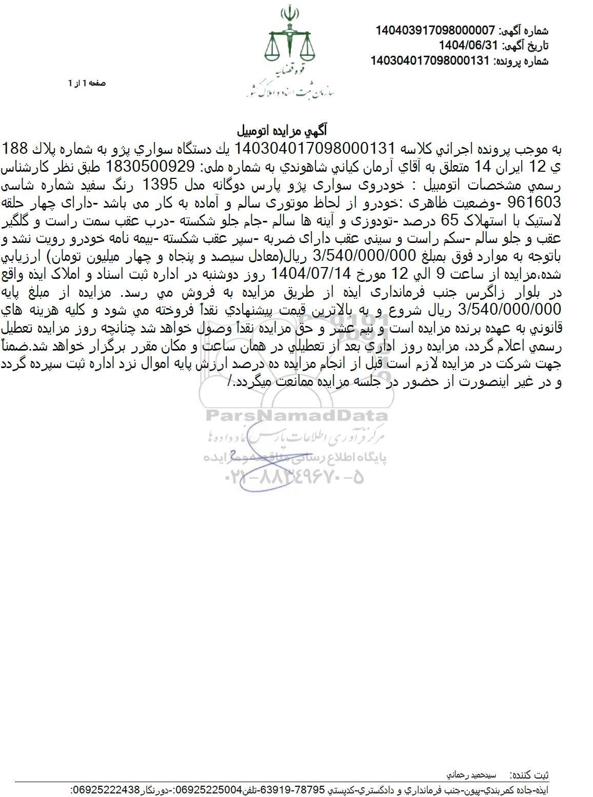 به موجب پرونده اجرائی کلاسه 140304017098000131 یک دستگاه سواری پژو به شماره پلاک 188 ی 12 ایران 14 متعلق به آقای آرمان کیانی شاهوندی به شماره ملی: 1830500929 طبق نظر کارشناس رسمی مشخصات اتومبیل : خودروی سواری پژو پارس دوگانه مدل 1395 رنگ سفید شماره شاسی 961603 - وضعیت ظاهری خودرو از لحاظ موتوری سالم و آماده به کار میباشد - دارای چهار حلقه لاستیک با استهلاک 65 درصد تودوزی و اینه ها سالم - جام جلو شکسته - درب عقب سمت راست و گلگیر عقب و جلو سالم سکم راست و سینی عقب دارای ضربه سپر عقب شکسته بیمه نامه خودرو رویت نشد و با توجه به موارد فوق بمبلغ 3.540.000.000 ریال (معادل سیصد و پنجاه و چهار میلیون تومان) ارزیابی شده، مزایده از ساعت 9 الی 12 مورخ 1404.07.14 روز دوشنبه در اداره ثبت اسناد و املاک ایذه واقع در بلوار زاگرس جنب فرمانداری ایده از طریق مزایده به فروش می رسد. مزایده از مبلغ پایه 3.540.000.000 ریال شروع و به بالاترین قیمت پیشنهادی نقداً فروخته می شود و کلیه هزینه های قانونی به عهده برنده مزایده است و نیم عشر و حق مزایده نقداً وصول خواهد شد چنانچه روز مزایده تعطیل رسمی اعلام گردد مزایده روز اداری بعد از تعطیلی در همان ساعت و مکان مقرر برگزار خواهد شد. ضمناً جهت شرکت در مزایده لازم است قبل از انجام مزایده ده درصد ارزش پایه اموال نزد اداره ثبت سپرده گردد و در غیر اینصورت از حضور در جلسه مزایده ممانعت میگردد.