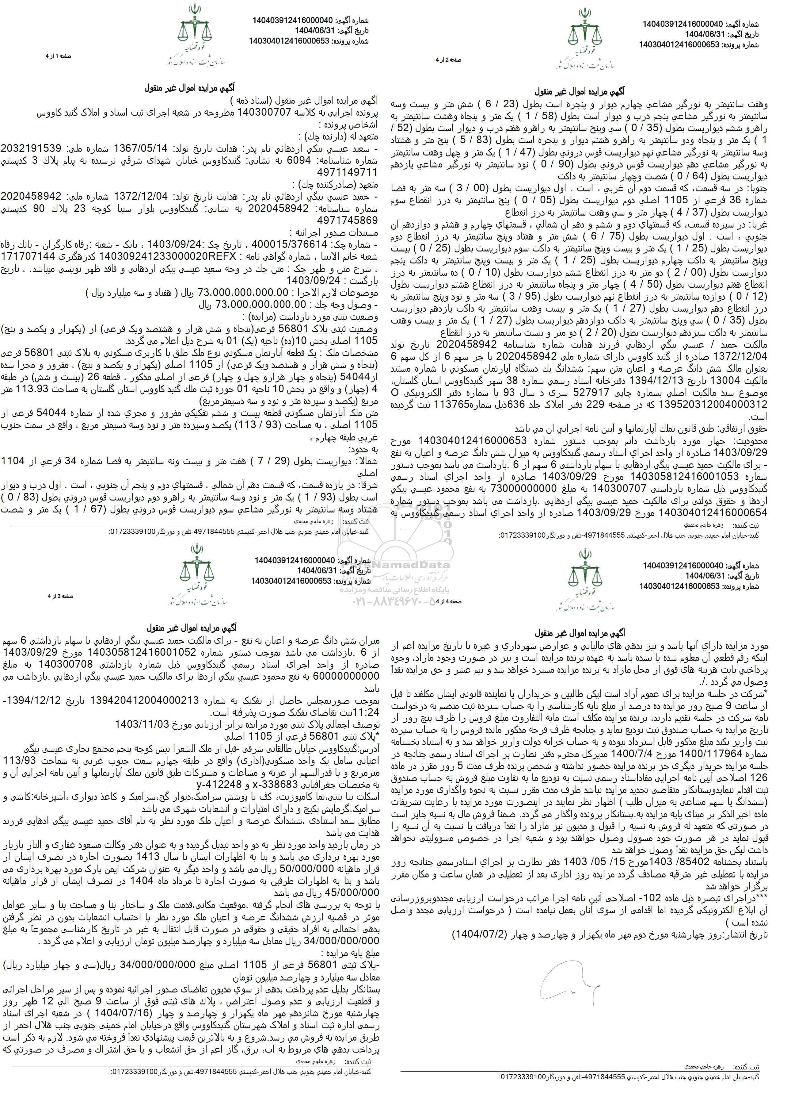 مزایده فروش یک قطعه اپارتمان مسکونی به پلاک ثبتی 56801 فرعی از 1105 اصلی مفروز و مجزا شده از 54044 فرعی از اصلی به مساحت 113.93 مترمربع به مبلغ 34.000.000.000 ریال