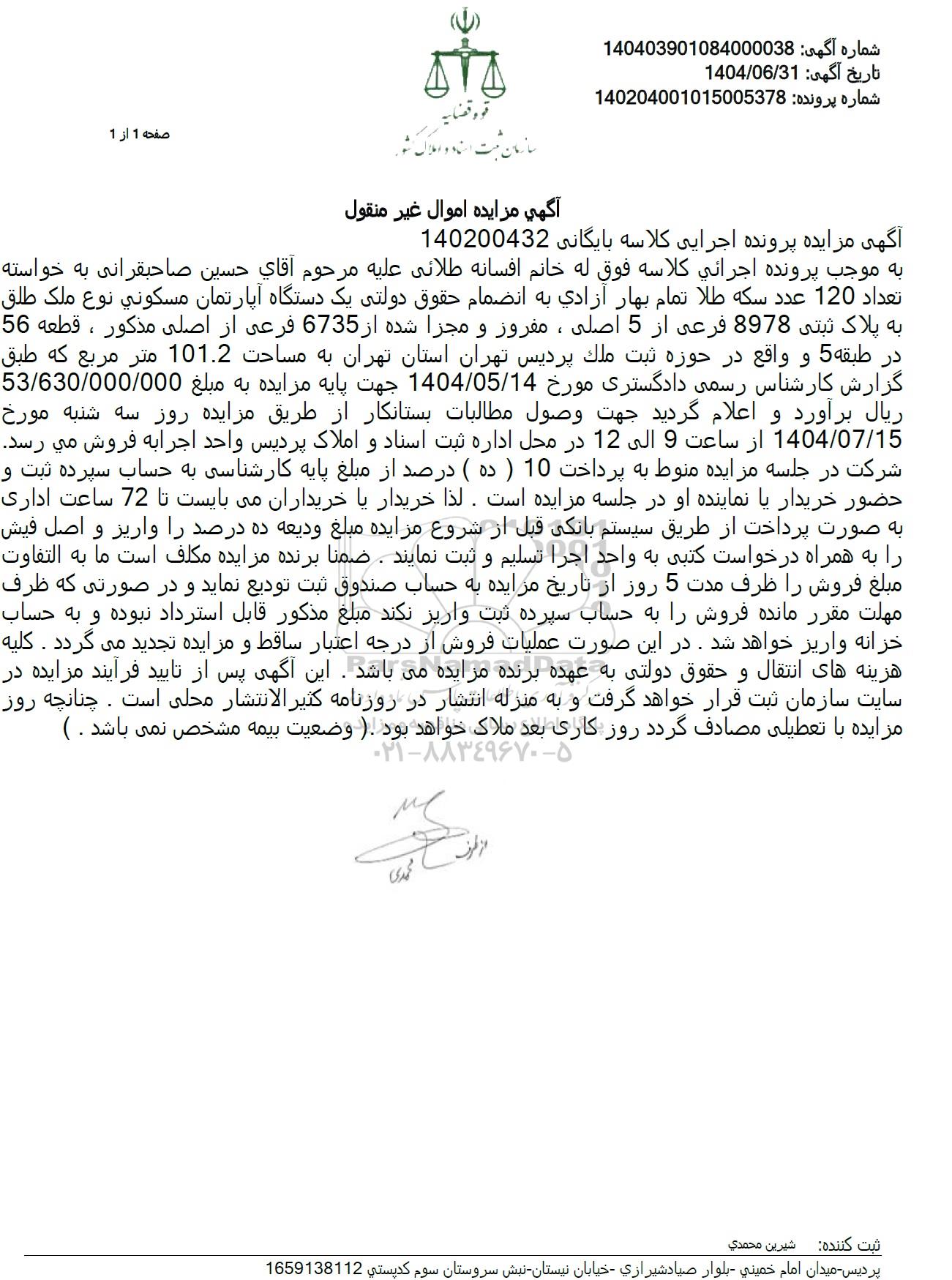 به موجب پرونده اجرائي كلاسه فوق له خانم افسانه طلائی علیه مرحوم آقاي حسين صاحبقرانی به خواسته تعداد 120 عدد سکه طلا تمام بهار آزادی به انضمام حقوق دولتی یک دستگاه آپارتمان مسکوني نوع ملک طلق به پلاک ثبتی 8978 فرعی از 5 اصلی ، مفروز و مجزا شده از 6735 فرعی از اصلی مذکور ، قطعه 56 در طبقه 5 و واقع در حوزه ثبت ملک پردیس تهران استان تهران به مساحت 101.2 متر مربع که طبق گزارش کارشناس رسمی دادگستری مورخ 1404.05.14 جهت پایه مزایده به مبلغ 53.630.000.000 ریال برآورد و اعلام گردید جهت وصول مطالبات بستانکار از طریق مزایده روز سه شنبه مورخ 1404.07.15 از ساعت 9 الی 12 در محل اداره ثبت اسناد و املاک پردیس واحد اجرا به فروش می رسد. شرکت در جلسه مزایده منوط به پرداخت 10 ) ده ( درصد از مبلغ پایه کارشناسی به حساب سپرده ثبت و حضور خریدار یا نماینده او در جلسه مزایده است. لذا خریدار یا خریداران می بایست تا 72 ساعت اداری به صورت پرداخت از طریق سیستم بانکی قبل از شروع مزایده مبلغ ودیعه ده درصد را واریز و اصل فیش را به همراه درخواست کتبی به واحد اجرا تسلیم و ثبت نمایند . ضمنا برنده مزایده مکلف است ما به التفاوت مبلغ فروش را ظرف مدت 5 روز از تاریخ مزایده به حساب صندوق ثبت تودیع نماید و در صورتی که ظرف مهلت مقرر مانده فروش را به حساب سپرده ثبت واریز نکند مبلغ مذکور قابل استرداد نبوده و به حساب خزانه واریز خواهد شد. در این صورت عملیات فروش از درجه اعتبار ساقط و مزایده تجدید می گردد . کلیه هزینه های انتقال و حقوق دولتی به عهده برنده مزایده میباشد. این آگهی پس از تایید فرآیند مزایده در سایت سازمان ثبت قرار خواهد گرفت و به منزله انتشار در روزنامه کثیر الانتشار محلی است . چنانچه روز مزایده با تعطیلی مصادف گردد روز کاری بعد ملاک خواهد بود . ) وضعیت بیمه مشخص نمی باشد . )