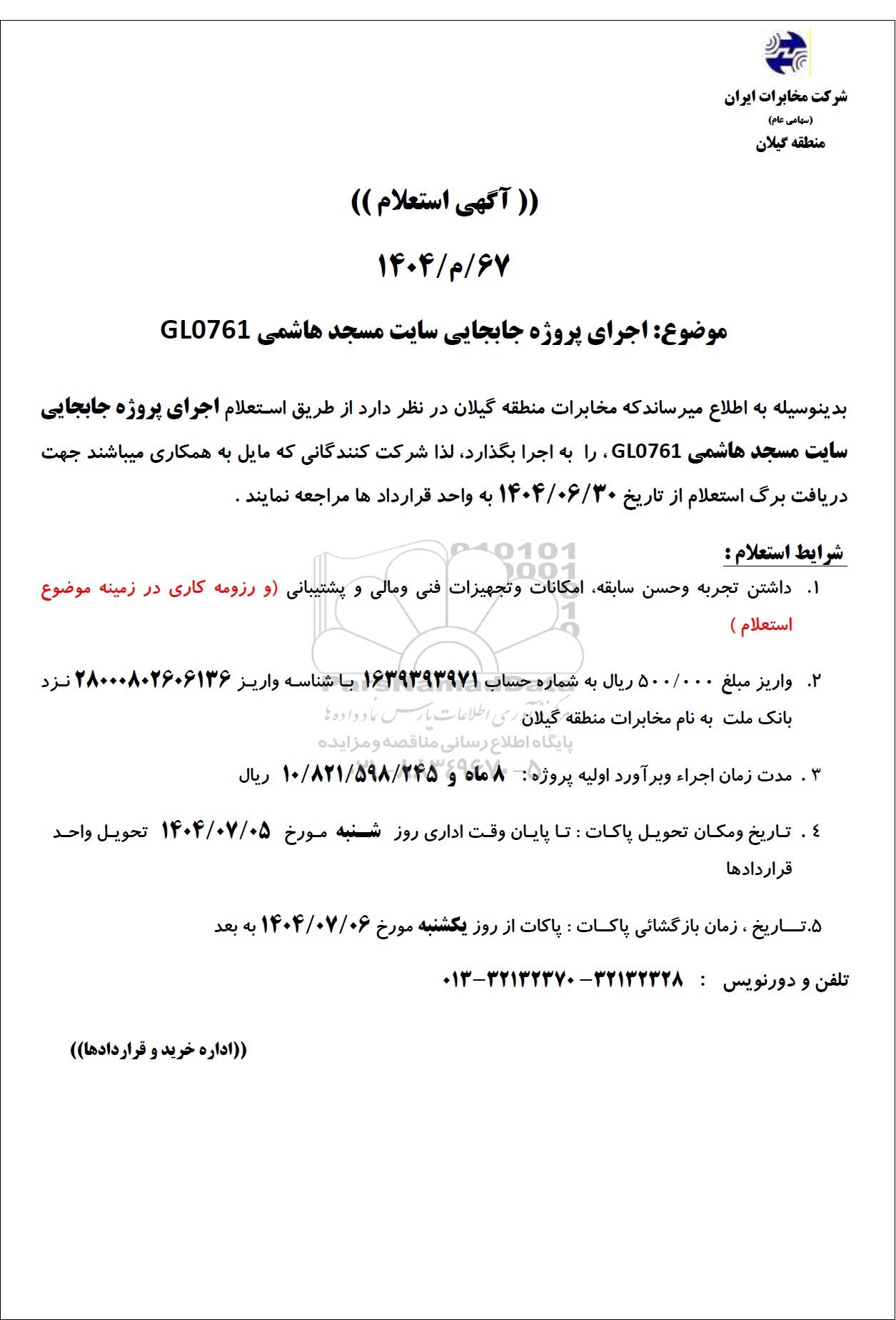 بدینوسیله به اطلاع میرساند که مخابرات منطقه گیلان در نظر دارد از طریق استعلام اجرای پروژه جابجایی سایت مسجد هاشمی GL0761، را به اجرا بگذارد، لذا شرکت کنندگانی که مایل به همکاری می باشند جهت دریافت برگ استعلام از تاریخ 1404.06.30 به واحد قراردادها مراجعه نمایند .