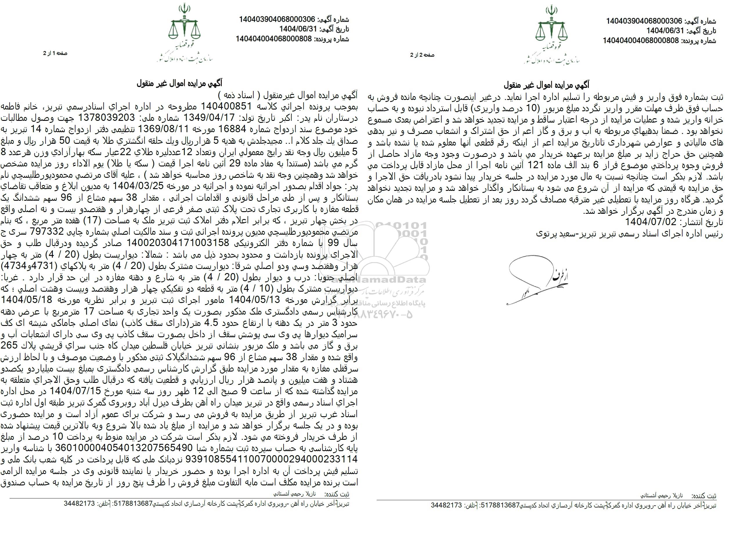 بموجب پرونده اجرائي كلاسه 140400851 مطروحه در اداره اجراي اسنادرسمي تبريز خانم فاطم درستاران نام پدر اکبر تاریخ تولد: 1349.04.17 شماره ملی 1378039203 جهت وصول مطالبات خود موضوع سند ازدواج شماره 16884 مورخه 1369.08.11 تنظیمی دفتر ازدواج شماره 14 تبریز بـ صداق يك جلد كلام ... مجید جلدش به هدیه 5 هزار ریال و يك حلقه انگشتری طلا به قیمت 50 هزار ریال و مبل 5 میلیون ریال وجه نقد رايج معمولی ایران و تعداد 12 عدد ليره طلاي 22 عيار سکه بهار آزادي وزن هر عدد 3 گرم می باشد مستندا) به مفاد ماده 29 آئین نامه اجرا قیمت ) سكه يا (طلا) يوم الاداء روز مزایده مشخص خواهد شد و همچنین وجه نقد به شاخص روز محاسبه خواهد شد ) ، علیه آقای مرتضي محمودپور طلیسچی نا پدر جواد اقدام بصدور اجرائیه نموده و اجرائیه در مورخه 1404.03.25 به مدیون ابلاغ و متعاقب تقاضای بستانکار و پس از طی مراحل قانونی و اقدامات اجرائی ، مقدار 38 سهم مشاع از 96 سهم ششدانگ یک قطعه مغازه با کاربری تجاری تحت پلاک ثبتی صفر فرعی از چهار هزار و هفتصد و بیست و نه اصلی واقع در بخش چهار تبریز ، که برابر اعلام دفتر املاک ثبت تبریز ملک به مساحت (17) هفده متر مربع ، که بنا مرتضي محمودپور طلیسچی مدیون پرونده اجرائی ثبت و سند مالکیت اصلی بشماره چاپی 797332 سری = سال 99 با شماره دفتر الکترونيکي 140020304171003158 صادر گردیده و در قبال طلب و حق الاجرای پرونده بازداشت و محدود بحدود ذیل میباشد: شمالا دیواریست بطول 20 . 4 متر به چهاد هزار و هفتصد وسي و دو اصلي شرقا دیواریست مشترک بطول 20 . (4) متر به پلاکهاي (4731 و 4734 اصلي جنوبا درب و ديوار بطول 20 . 4 متر به شارع و دهنه مغازه در این حد قرار دارد . غربا دیواریست مشترک بطول (10) . (4) متر به قطعه دو تفکيکي چهار هزار و هفتصد و بیست و هشت اصلي ؛ كـ برابر گزارش مورخه 1404.05.13 مامور اجرای ثبت تبریز و برابر نظریه مورخه 1404.05.18 کارشناس رسمی دادگستری ملک مذکور بصورت ورت یک واحد تجاری به مساحت 17 متر مربع با عرض دهن حدود 3 متر در یک دهنه با ارتفاع حدود 4.5 متر دارای سقف کاذب نمای اصلی جاماکی شیشه ای کف سرامیک دیوارها پی وی سی پوشش سقف از داخل بصورت سقف کاذب پی وی سی دارای انشعابات آب -برق و گاز میباشد و ملک مزبور بنشانی تبریز خیابان فلسطین میدان گاه جنب سراي قريشي پلاك 265 واقع شده و مقدار 38 سهم مشاع از 96 سهم ششدانگ پلاک ثبتی مذکور با وضعیت موصوف و با لحاظ ارزشی سرقفلی مغازه به مقدار مورد مزایده طبق گزارش کارشناس رسمی دادگستری بمبلغ بیست میلیارد و یکصد هشتاد و هفت میلیون و پانصد هزار ریال ارزیابی و قطعیت یافته که در قبال طلب وحق الاجراي متعلقه بـ مزایده گذاشته شده که از ساعت 9 صبح الی 12 ظهر روز سه شنبه مورخ 1404.07.15 در محل ادار اجرای اسناد رسـ رسمی واقع در تبریز میدان راه آهن بطرف دیزل آباد روبروی گمرک تبریز طبقه اول اداره ثبت اسناد غرب تبریز از طریق مزایده به فروش میرسد و شرکت برای عموم آزاد است و مزایده حضوری بوده و در یک جلسه برگزار خواهد شد و مزایده از مبلغ یاد شده بالا شروع و به بالاترین قیمت پیشنهاد شد از طرف خریدار فروخته ميشود. لازم بذکر است شرکت در مزایده منوط به پرداخت 10 درصد از مبل پایه کارشناسی به حساب سپرده ثبت بشماره شبا 360100004054013207565490 با شناسه وارید 939108554110070000294000233114 نزدبانک ملی که قابل پرداخت در کلیه شعب بانک ملی -تسلیم فیش پرداخت آن به اداره اجرا بوده و حضور خریدار یا نماینده قانونی وی در جلسه مزایده الزامی است برنده مزایده مکلف است ما به التفاوت مبلغ فروش را ظرف پنج روز از تاریخ مزایده به حساب صندوق