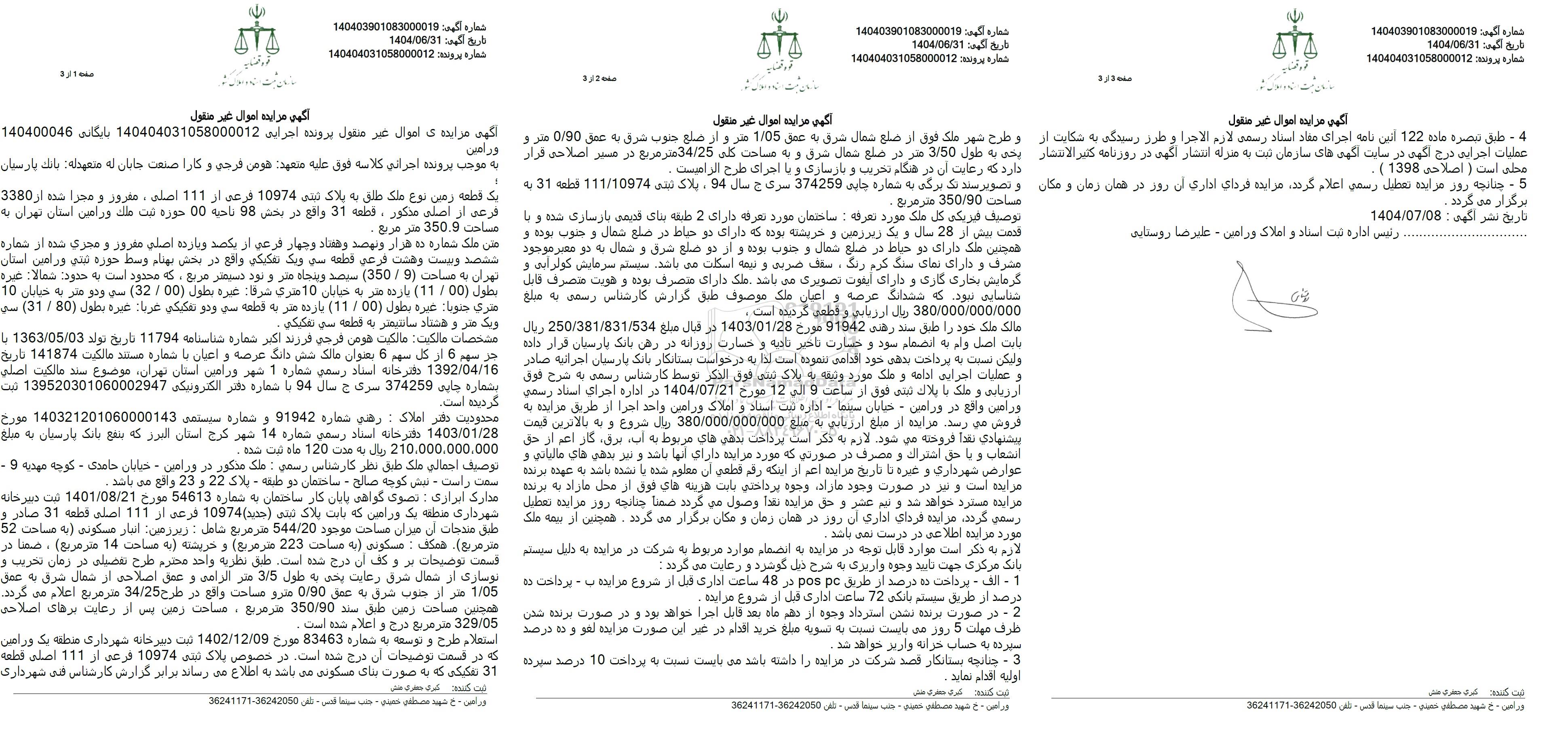 ملک شماره ده هزار و نهصد و هفتاد و چهار فرعی از یکصد و یازده اصلی مفروز و مجزی شده از شماره 140 ششصد و بیست و هشت فرعی قطعه سی و یک تفکیکی واقع در بخش بهنام وسط حوزه ثبتی ورامین استان تهران به (مساحت 9 / 350) سیصد و پنجاه متر و نود دسیمتر مربع ، که محدود است به حدود شمالا غیره بطول (00 / 11) یازده متر به خیابان 10 متری شرقا غیره بطول (00 / (32) سی و دو متر به خیابان 10 سیان متری جنوبا : غیره بطول 00 / (11) یازده متر به قطعه سی و دو تفکیکی غربا غیره بطول (80 / 31) سی و یک متر و هشتاد سانتیمتر به قطعه سی تفکیکی توصیف اجمالی ملک طبق نظر کارشناس رسمی : ملک مذکور در ورامین - خیابان حامدی - کوچه مهدیه 9 سمت راست - نبش کوچه صالح - ساختمان دو طبقه - پلاک 22 و 23 واقع می باشد .که ششدانگ عرصه و اعیان ملک موصوف طبق گزارش کارشناس رسمی به مبلغ 380.000.000.000 ریال ارزیابی و قطعی گردیده است ، پلاک ثبتی فوق از ساعت 9 الی 12 مورخ 1404.07.21 در اداره اجرای اسناد رسمی : ورامین واقع در ورامین - خیابان سینما - اداره ثبت اسناد و املاک ورامین واحد اجرا از طریق مزایده به فروش می رسد. مزایده از مبلغ ارزیابی به مبلغ 380.000.000.000 ریال شروع و به بالاترین قیمت پیشنهادی نقداً فروخته می شود.
