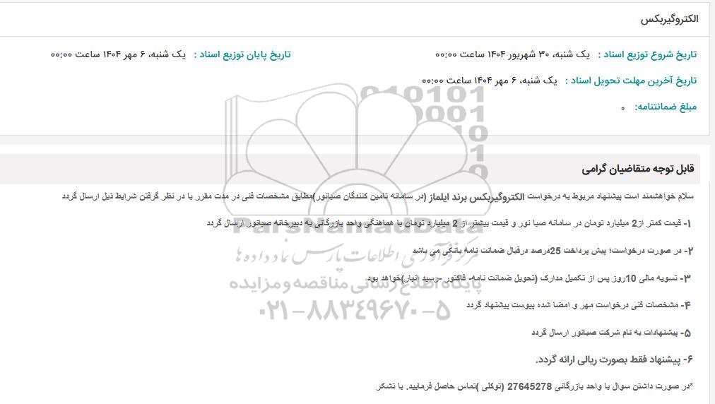 نحوه دریافت اسناد و ارسال پیشنهاد: متقاضیان می‌توانند با ثبت نام در سامانه مناقصات و مزایدات ایران (پارس نماد) نسبت به مشاهده اسناد استعلام، دریافت اطلاعات تکمیلی، و ثبت پیشنهاد قیمت خود اقدام نمایند. در صورت نیاز به دریافت راهنمایی یا پشتیبانی در خصوص استعلام و مناقصه و فراخوان مناقصه عمومی، مناقصه محدود، مناقصه بین‌ المللی، مناقصه دولتی، مناقصه خصوصی، مناقصه آنلاین فروش تجهیزات، مناقصه مشاوره‌ای مناقصه پتروشیمی و انرژی مناقصه صنایع و تجهیزات برق و مخابرات و نفت و گاز ... لطفاً با سایت خبری مناقصه و مزایده پارس‌نماد داده‌ها به شماره 88349670 تماس حاصل فرمایید.