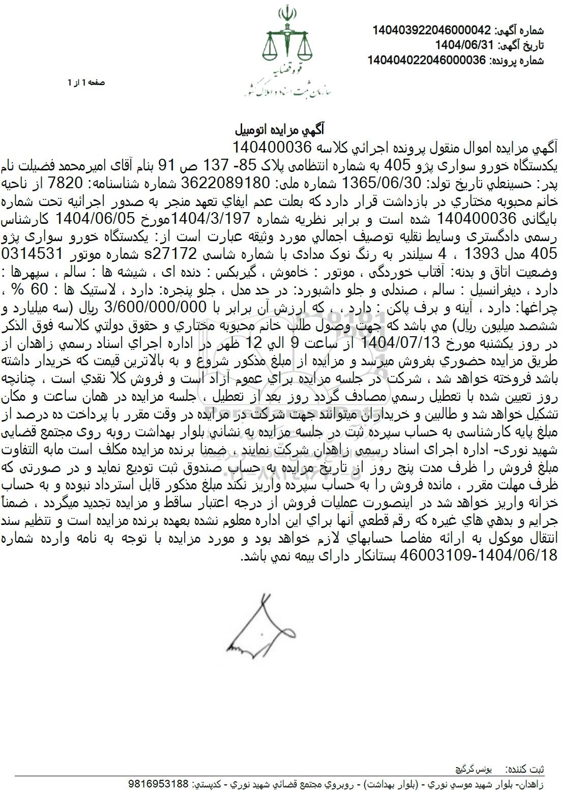 یک دستگاه خورو سواری پژو 405 به شماره انتظامی پلاک 1375 ص 91 بنام آقای امیر محمد فضیلت نام پدر حسينعلی تاريخ تولد: 1365.06.30 شماره ملی 3622089180 شماره شناسنامه: 7820 از ناحیه خانم محبوبه مختاری در بازداشت قرار دارد که بعلت عدم ایفای تعهد منجر به صدور اجرائیه تحت شماره بایگانی 140400036 شده است و برابر نظریه شماره 1404.3.197 مورخ 1404.06.05 کارشناس رسمی دادگستری وسایط نقليه توصيف اجمالی مورد وثیقه عبارت است از: یکدستگاه خورو سواری پژو 405 مدل 1393، 4 سیلندر به رنگ نوک مدادی با شماره شاسی 27172 شماره موتور 0314531 وضعیت اتاق و بدنه آفتاب خوردگی ، موتور : خاموش ، گیربکس : دنده ای ، شیشه ها : سالم ، سپهرها : دارد ، دیفرانسیل : سالم ، صندلی و جلو داشبورد در حد مدل ، جلو پنجره دارد ، لاستیک ها : 60 %، چراغها دارد، آینه و برف پاکن : دارد ، ، که ارزش آن برابر با 3.600.000.000 ریال سه میلیارد و ششصد میلیون ریال می باشد که جهت وصول طلب خانم محبوبه مختاري و حقوق دولتی كلاسه فوق الذكر در روز یکشنبه مورخ 1404.07.13 از ساعت 9 الی 12 ظهر در اداره اجراي اسناد رسمی زاهدان از طریق مزایده حضوري بفروش میرسد و مزایده از مبلغ مذکور شروع و به بالاترین قیمت که که خریدار داشته باشد فروخته خواهد شد، شرکت در جلسه مزایده برای عموم آزاد است و فروش کلا نقدی است ، چنانچه روز تعیین شده با تعطیل رسمی مصادف گردد روز بعد از تعطیل ، جلسه مزایده در همان ساعت و مکان تشکیل خواهد شد و طالبین و خریداران میتوانند جهت شرکت در مزایده در وقت مقرر با پرداخت ده درصد از مبلغ پایه کارشناسی به حساب سپرده ثبت در جلسه مزایده به نشاني بلوار بهداشت روبه روی مجتمع قضایی شهید نوری اداره اجرای اسناد رسمی زاهدان شرکت نمایند، ضمنا برنده مزایده مکلف است ما به التفاوت مبلغ فروش را ظرف مدت پنج روز از تاریخ مزایده به حساب صندوق ثبت تودیع نماید و در صورتی که ظرف مهلت مقرر ، مانده فروش را به حساب سپرده واریز نکند مبلغ مذکور قابل استرداد نبوده و به حساب خزانه واریز خواهد شد در اینصورت عملیات فروش از درجه اعتبار ساقط و مزایده تجدید میگردد ، ضمنا جرایم و بدهي های غيره که رقم قطعی آنها برای این اداره معلوم نشده بعهده برنده مزایده است و تنظیم سند انتقال موکول به ارائه مفاصا حسابهاي لازم خواهد بود و مورد مزایده با توجه به نامه وارده شماره 46003109-1404.06.18 بستانکار دارای بیمه نمی باشد.