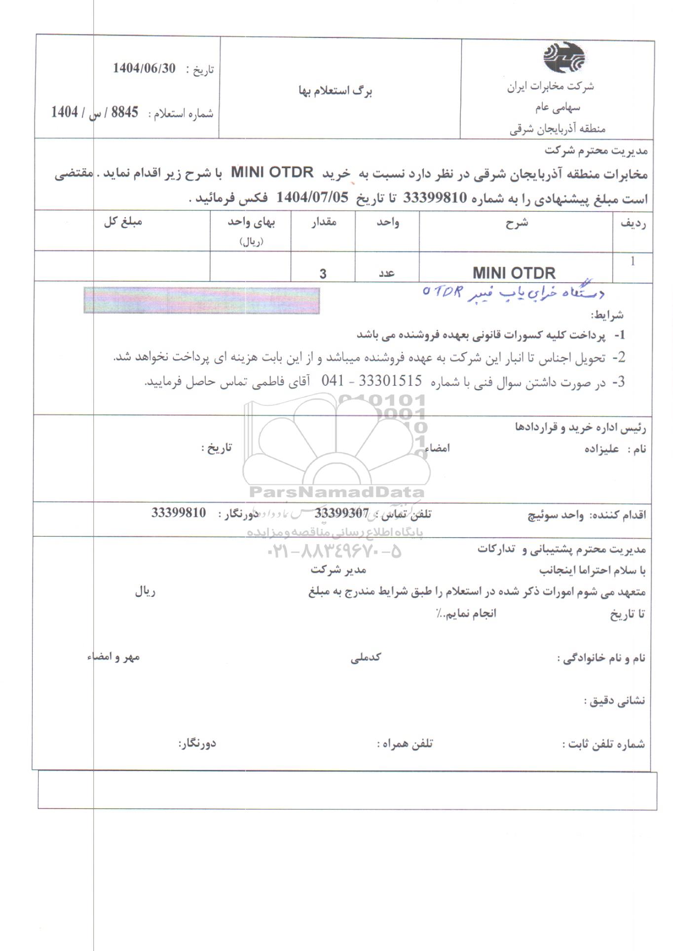 مخابرات منطقه آذربایجان شرقی در نظر دارد نسبت به خرید MINI OTDR به شرح زیر اقدام نماید. مقتضی است مبلغ پیشنهادی را به شماره 33399810 تا تاریخ 1404.7.5 فکس فرمایید.