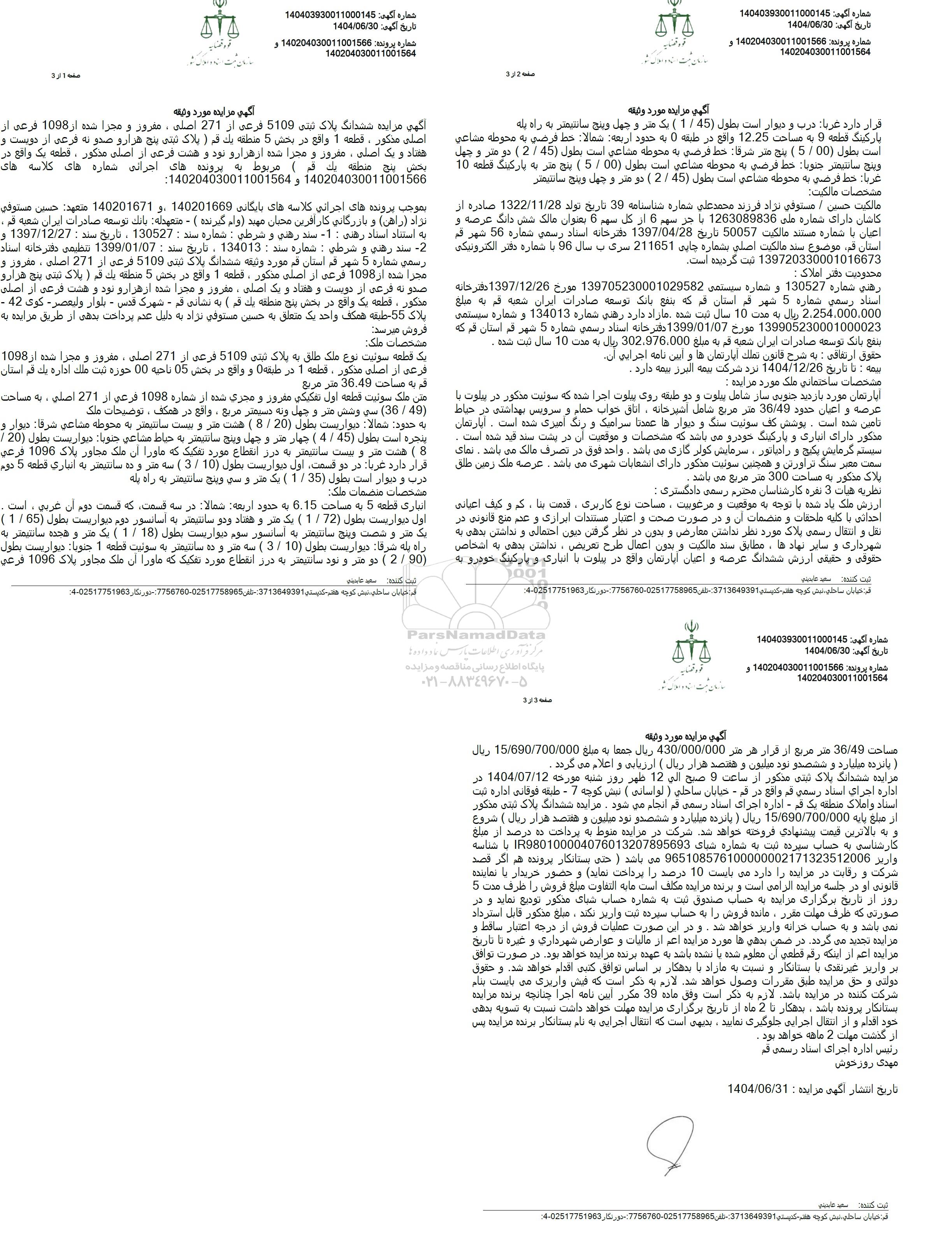 اگهی مزایده ششدانگ پلاک ثبتی 5109 فرعی از 2/1 اصلی ، مفروز و مجزا شده از 1098 فرعی از اصلی مذکور، قطعه 1 واقع در بخش 5 منطقه یک قم ( پلاک ثبتی پنج هزار و صدو نه فرعی از دویست و هفتاد و یک اصلی، مفرور و مجزا شده از هزار و نود و هشت فرعی از اصلی مذکور، قطعه یک واقع در بخش پنج منطقه یک قم 9  مربوط به پرونده های اجرائی شماره های کلاسه های :140204030011001564 140204030011001566 و