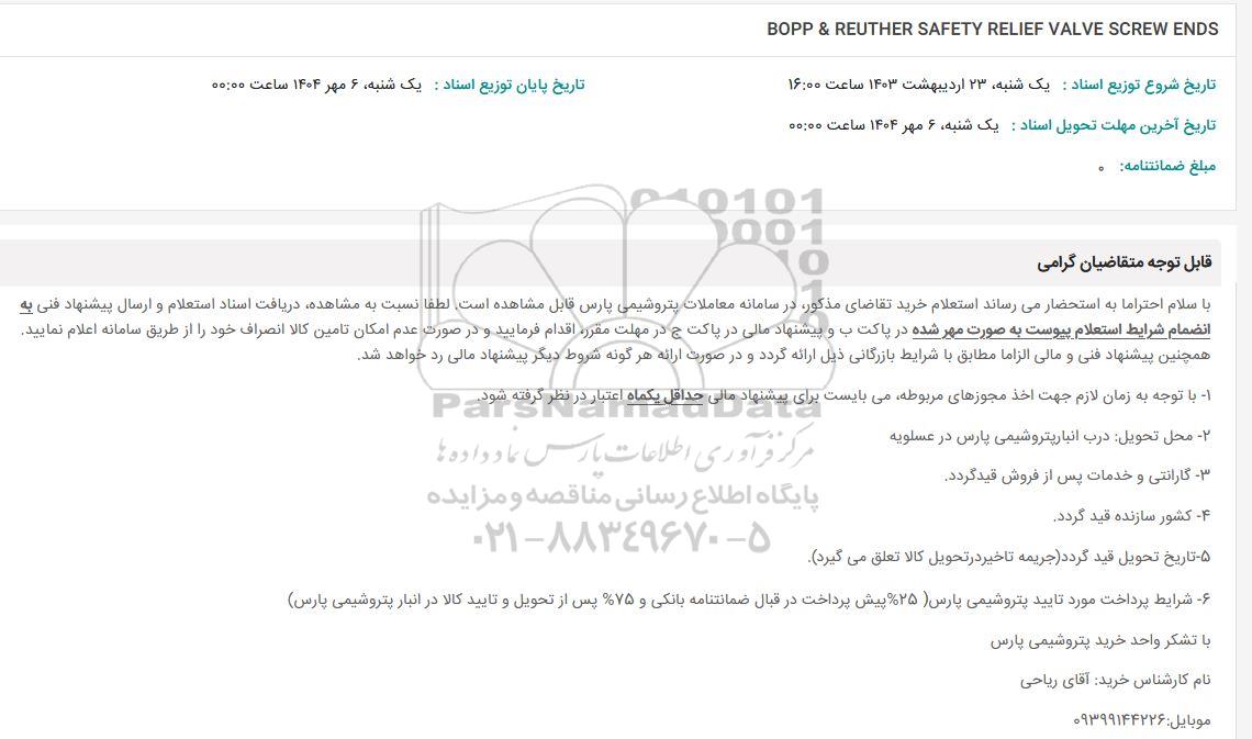 استعلام بها و موضوع استعلام استعلام BOPP & REUTHER SAFETY RELIEF VALVE SCREW ENDS به اطلاع کلیه شرکتها و افراد متخصص واجد شرایط میرساند، آگهی گذار در نظر دارد از طریق استعلام بها، نسبت به انتخاب و دریافت پیشنهادات اقدام نماید. این استعلام با کد آگهی ثبت شده در سامانه خبرگزاری پارس نماد : 9585511 منتشر شده است. مشخصات استعلام : تاریخ شروع استعلام: 1404/06/31 آخرین مهلت ارسال پیشنهاد قیمت : 1404/07/06 و محل اجرای پروژه : استان بوشهر میباشد. استعلام قیمت مورد درخواست : استعلام BOPP & REUTHER SAFETY RELIEF VALVE SCREW ENDS با دستهبندیهای تخصصی و گروه های مرتبط : پیچ و مهره, شیرآلات, تجهیزات نفت و گاز, استعلام اطلاع رسانی میگردد. شرایط شرکت در استعلام آنلاین : ابتدا ثبت نام در سامانه استعلام پارس نماد و تکمیل مدارک موردنیاز و بارگذاری در سامانه رعایت تمامی ضوابط و الزامات مندرج در اسناد استعلام است.
