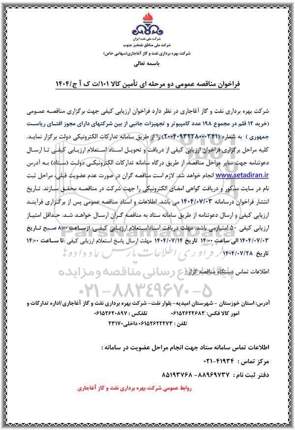 شرکت بهره برداری نفت و گاز آغاجاری در نظر دارد فراخوان ارزیابی کیفی جهت برگزاری مناقصه عمومی خرید 12 قلم در مجموع 198 عدد کامپیوتر و تجهیزات جانبی از بین شرکتهای دارای مجوز افتای ریاست جمهوری ) به شماره 2004093228000341 را از طریق سامانه تدارکات الکترونیکی دولت برگزار نماید.
