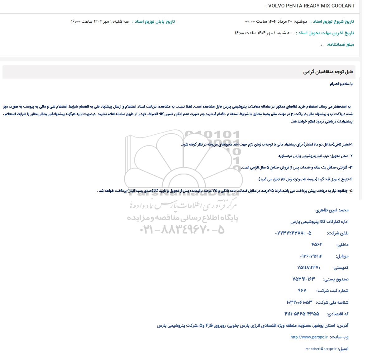 به استحضار میرساند استعلام خرید تقاضای مذکور در سامانه معاملات پتروشیمی پارس قابل مشاهده است. لطفا نسبت به مشاهده دریافت اسناد استعلام و ارسال پیشنهاد فنی به انضمام شرایط استعلام فنی و مالی به پیوست به صورت مهر شده دریاکت ب و پیشنهاد مالی در پاکت ج در مهلت مقرر و عینا مطابق با شرایط استعلام ، اقدام فرمایید و در صورت عدم امکان تامین کالا انصراف خود را از طریق سامانه اعلام نمایید. در صورت ارایه هرگونه پیشنها دفنی و مالی مغایر با شرایط استعلام، پیشنهادات دریافتی مردود اعلام خواهد شد.