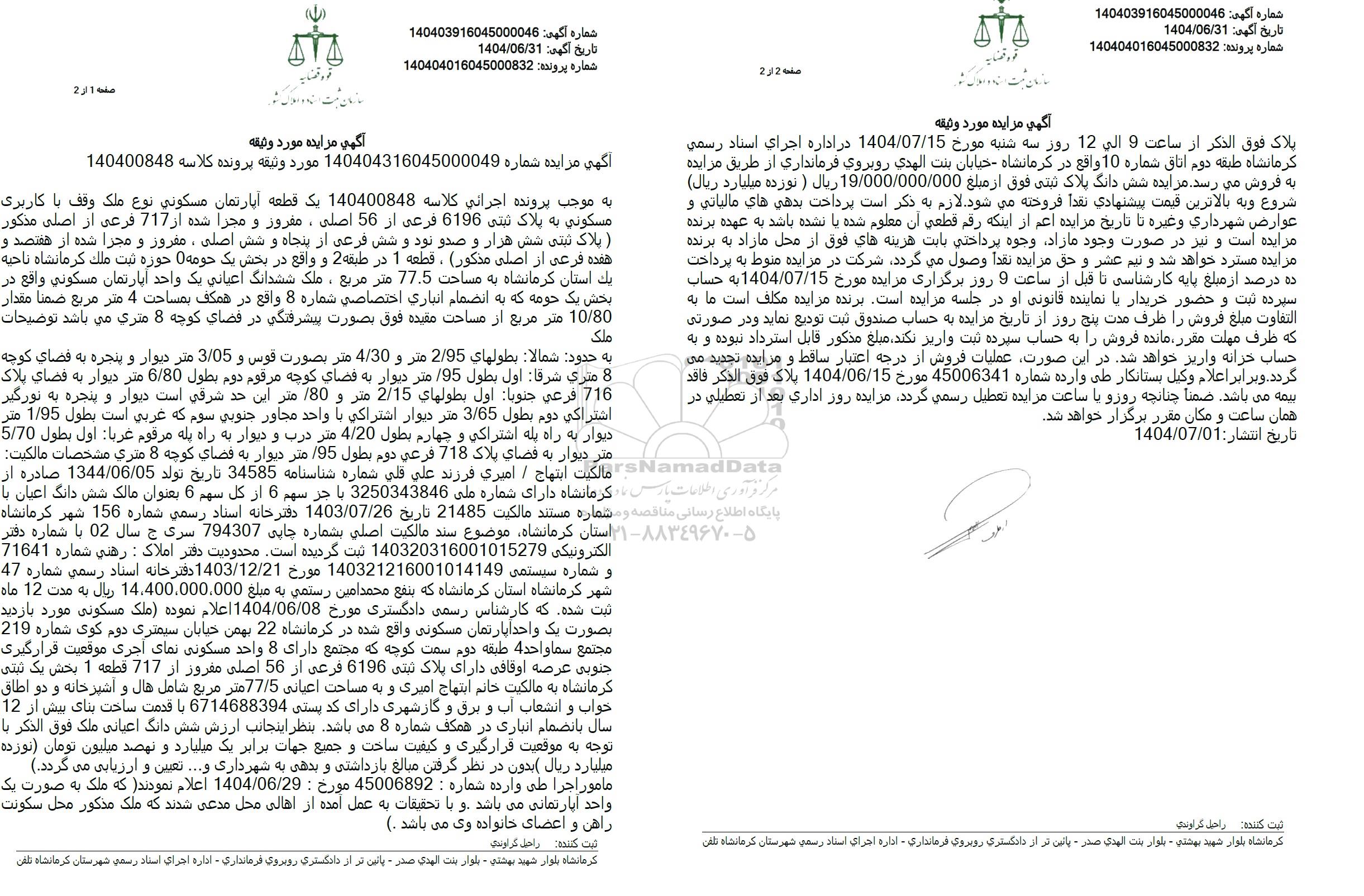 به موجب پرونده اجرائي كلاسه 140400848 یک قطعه آپارتمان مسکوني نوع ملک وقف با کاربری مسکوني به پلاک ثبتی 6196 فرعی از 56 اصلی ، مفروز و مجزا شده از 717 فرعی از اصلی مذکور ) پلاک ثبتی شش هزار و صدو نود و شش فرعی از پنجاه و شش اصلی، مفروز و مجزا شده از هفتصد و هفده فرعی از اصلی (مذکور) ، قطعه 1 در طبقه 2 و واقع در بخش یک حومه حوزه ثبت ملك كرمانشاه ناحيه يك استان کرمانشاه به مساحت 77.5 متر مربع ، ملک ششدانگ اعیانی یک واحد آپارتمان مسکونی واقع در بخش یک حومه که به انضمام انباري اختصاصي شماره 8 واقع در همکف بمساحت 4 متر مربع ضمنا مقدار 10.80 متر مربع از مساحت مقیده فوق بصورت پیشرفتگي در فضاي کوچه 8 متري مي باشد توضیحات ملک