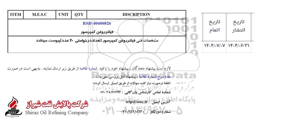 مشخصات فنی فیلتر روغن کمپرسور ( تعداد درخواستی 20 عدد ) پیوست میباشد
