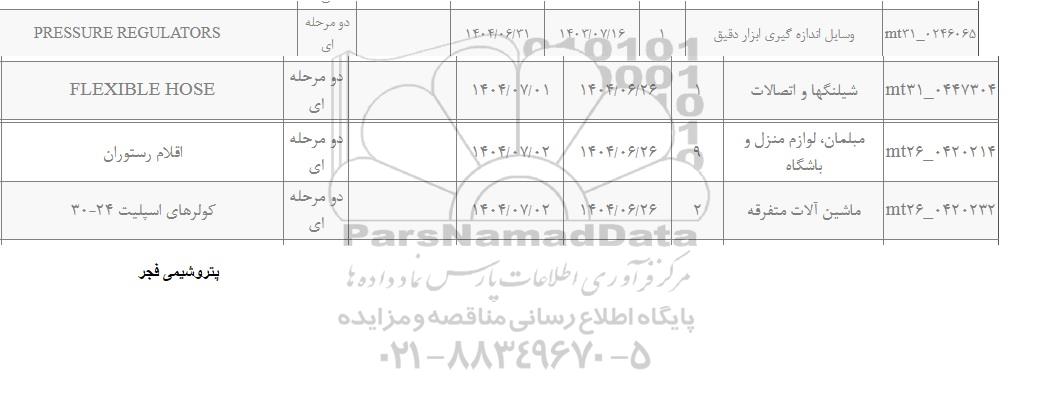 | mt31-0447304 | شیلنگها و اتصالات | 1 | 1404.07.01 | دو مرحله ای | FLEXIBLE HOSE |