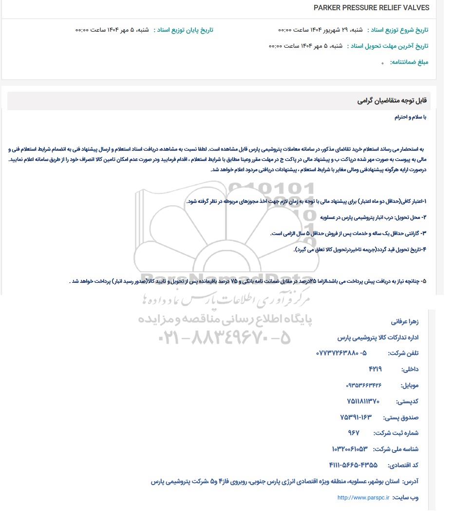 6 استعلام خرید 10 قلم SAFTY RELIEFE VALVE 9810550 1404/08/15 new not special not payed بوشهر