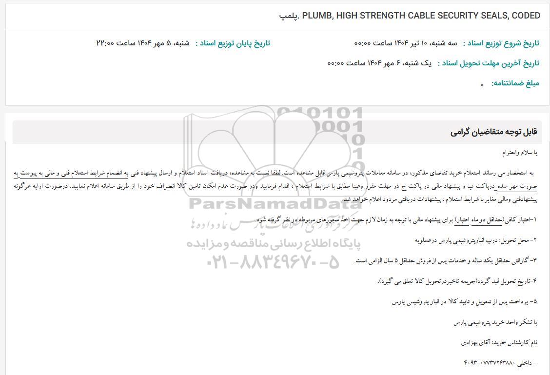 استعلام بها و موضوع استعلام استعلام PLUMB, HIGH STRENGTH CABLE SECURITY SEALS, CODED، پلمپ به اطلاع کلیه شرکتها و افراد متخصص واجد شرایط میرساند، آگهی گذار در نظر دارد از طریق استعلام بها، نسبت به انتخاب و دریافت پیشنهادات اقدام نماید. این استعلام با کد آگهی ثبت شده در سامانه خبرگزاری پارس نماد : 9585549 منتشر شده است. مشخصات استعلام : تاریخ شروع استعلام: 1404/06/31 آخرین مهلت ارسال پیشنهاد قیمت : 1404/07/05 و محل اجرای پروژه : استان بوشهر میباشد. استعلام قیمت مورد درخواست : استعلام PLUMB, HIGH STRENGTH CABLE SECURITY SEALS, CODED، پلمپ با دستهبندیهای تخصصی و گروه های مرتبط : پلمپ, تجهیزات نفت و گاز, استعلام اطلاع رسانی میگردد. شرایط شرکت در استعلام آنلاین : ابتدا ثبت نام در سامانه استعلام پارس نماد و تکمیل مدارک موردنیاز و بارگذاری در سامانه رعایت تمامی ضوابط و الزامات مندرج در اسناد استعلام است.