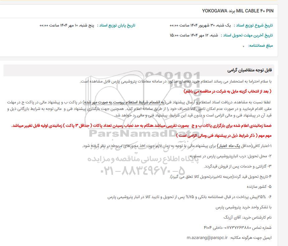نحوه دریافت اسناد و ارسال پیشنهاد: متقاضیان میتوانند با ثبت نام در سامانه مناقصات و مزایدات ایران (پارس نماد) نسبت به مشاهده اسناد استعلام، دریافت اطلاعات تکمیلی، و ثبت پیشنهاد قیمت خود اقدام نمایند. در صورت نیاز به دریافت راهنمایی یا پشتیبانی در خصوص استعلام و مناقصه و فراخوان مناقصه عمومی، مناقصه محدود، مناقصه بین المللی، مناقصه دولتی، مناقصه خصوصی، مناقصه آنلاین فروش تجهیزات، مناقصه مشاورهای مناقصه پتروشیمی و انرژی مناقصه صنایع و تجهیزات برق و مخابرات و نفت و گاز ... لطفاً با سایت خبری مناقصه و مزایده پارسنماد دادهها به شماره 88349670 تماس حاصل فرمایید.