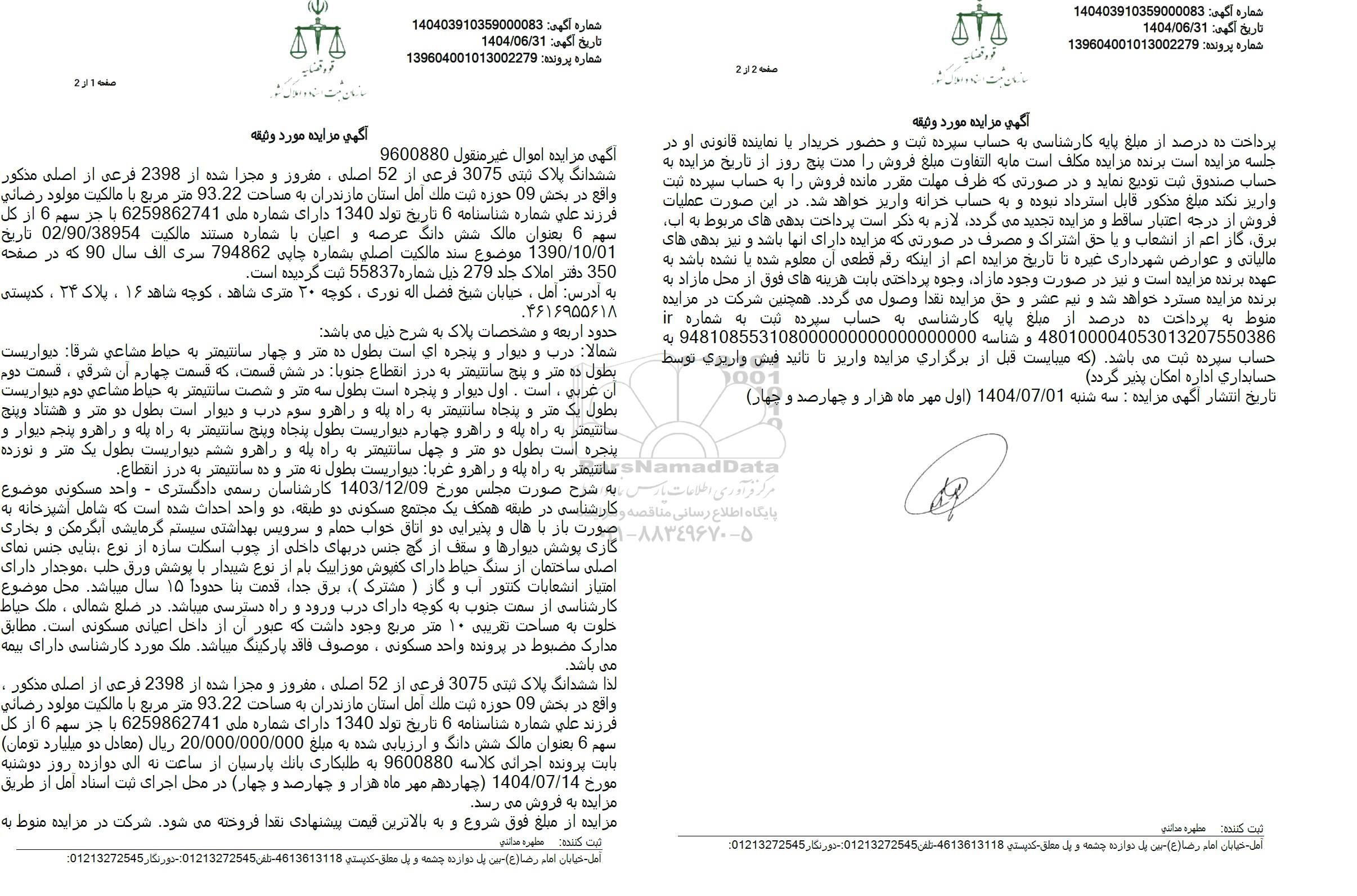 لذا ششدانگ پلاک ثبتی 3075 فرعی از 52 اصلی ، مفروز و مجزا شده از 2398 فرعی از اصلی مذکور واقع در بخش 09 حوزه ثبت ملک آمل استان مازندران به مساحت 93.22 متر مربع با مالکیت مولود رضائی فرزند علی شماره شناسنامه 6 تاریخ تولد 1340 دارای شماره ملی 6259862741 با جز سهم 6 از کل سهم 6 بعنوان مالک شش دانگ و ارزیابی شده به مبلغ 20.000.000.000 ریال (معادل دو میلیارد تومان) بابت پرونده اجرائی کلاسه 9600880 به طلبکاری بانک پارسیان از ساعت نه الی دوازده روز دوشنبه مورخ 1404.07.14 (چهاردهم مهر ماه هزار و چهارصد و چهار) در محل اجرای ثبت اسناد آمل از طریق مزایده به فروش می رسد.