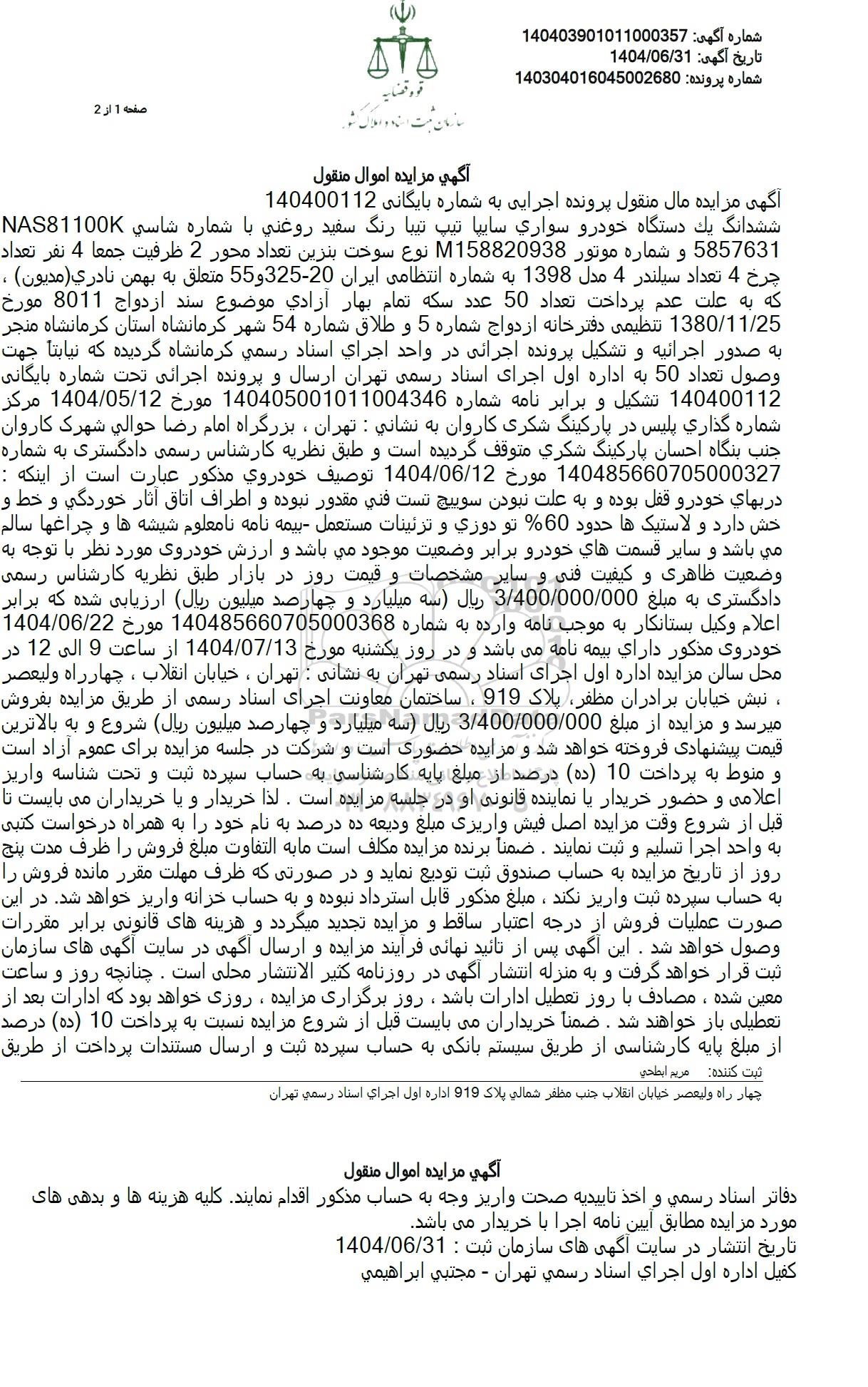 ششدانگ یک دستگاه خودرو سواری سایپا تیپ تیبا رنگ سفید روغنی با شماره شاسي NAS81100K 5857631 و شماره موتور M158820938 نوع سوخت بنزین تعداد محور 2 ظرفیت جمعا 4 نفر تعداد چرخ 4 تعداد سیلندر 4 مدل 1398 به شماره انتظامی ایران 20-325 و 55 متعلق به بهمن نادری (مدیون) . که به علت عدم پرداخت تعداد 50 عدد سکه تمام بهار آزادي موضوع سند ازدواج 8011 مورخ 1380/11/25 تنظیمی دفترخانه ازدواج شماره 5 و طلاق شماره 54 شهر کرمانشاه استان کرمانشاه منجر به صدور اجرائیه و تشکیل پرونده اجرائی در واحد اجرای اسناد رسمی کرمانشاه گردیده که نیابتا جهت وصول تعداد 50 به اداره اول اجرای اسناد رسمی تهران ارسال و پرونده اجرائی تحت شماره بایگانی 140400112 تشکیل و برابر نامه شماره 140405001011004346 مورخ 1404/05/12 مركز شماره گذاری پلیس در پارکینگ شکری کاروان به نشانی : تهران، بزرگراه امام رضا حوالی شهرک کاروان جنب بنگاه احسان پارکینگ شکری متوقف گردیده است و طبق نظریه کارشناس رسمی دادگستری به شماره : 140485660705000327 مورخ 1404.06.12 توصيف خودروي مذكور عبارت است از اینکه در بهای خودرو قفل بوده و به علت نبودن سوییچ تست فني مقدور نبوده و اطراف اتاق آثار خوردگی و خط و خش دارد و لاستیکها حدود 60 تو دوزی و تزئینات مستعمل - بیمه نامه نامعلوم شیشه ها و چراغها سالم می باشد و سایر قسمت هاي خودرو برابر وضعیت موجود میباشد و ارزش خودروی مورد نظر با توجه به وضعیت ظاهری و کیفیت فنی و سایر مشخصات و قیمت روز در بازار طبق نظریه کارشناس رسمی دادگستری به مبلغ 3.400.000.000 ریال سه میلیارد و چهارصد میلیون ریال ارزیابی شده که برابر 1404.06.22 اعلام وكيل بستانکار به موجب نامه وارده به شماره 140485660705000368 مورخ در خودروی مذکور دارای بیمه نامه میباشد و در روز یکشنبه مورخ 1404.07.13 از ساعت 9 الی 12 در محل سالن مزایده اداره اول اجرای اسناد رسمی تهران به نشانی : تهران ، خیابان انقلاب ، چهار راه ولیعصر ، نبش خیابان برادران مظفر پلاک 919، ساختمان معاونت اجرای اسناد رسمی از طریق مزایده بفروش میرسد و مزایده از مبلغ 3.400.000.000 ریال (سه میلیارد و چهار صد میلیون ریال) شروع و به بالاترین قیمت پیشنهادی فروخته خواهد شد و مزایده حضوری است و شرکت در جلسه مزایده برای عموم آزاد است. و منوط به پرداخت 10 (ده) درصد از مبلغ پایه کارشناسی به حساب سپرده ثبت و تحت شناسه واریز اعلامی و حضور خریدار یا نماینده قانونی او در جلسه مزایده است. لذا خریدار و یا خریداران می بایست تا قبل از شروع وقت مزایده اصل فیش واریزی مبلغ ودیعه ده درصد به نام خود را به همراه درخواست کتبی به واحد اجرا تسلیم و ثبت نمایند . ضمناً برنده مزایده مکلف است ما به التفاوت مبلغ فروش را ظرف مدت به روز از تاریخ مزایده به حساب صندوق ثبت تودیع نماید و در صورتی که ظرف مهلت مقرر مانده فروش را به حساب سپرده ثبت واریز نکند، مبلغ مذکور قابل استرداد نبوده و به حساب خزانه واریز خواهد شد. در این صورت عملیات فروش از درجه اعتبار ساقط و مزایده تجدید میگردد و هزینه های قانونی برابر مقررات وصول خواهد شد. این آگهی پس از تائید نهایی فرآیند مزایده و ارسال آگهی در سایت آگهی های سازمان ثبت قرار خواهد گرفت و به منزله انتشار آگهی در روزنامه کثیر الانتشار محلی است. چنانچه روز و ساعت معین شده ، مصادف با روز تعطیل ادارات باشد، روز برگزاری مزایده، روزی خواهد بود که ادارات بعد از تعطیلی باز خواهند شد. ضمنا خریداران می بایست قبل از شروع مزایده نسبت به پرداخت 10 (ده) درصد از مبلغ پایه کارشناسی از طریق سیستم بانکی به حساب سپرده ثبت و ارسال مستندات پرداخت از طریق دفاتر اسناد رسمي و اخذ تاییدیه صحت واریز وجه به حساب مذکور اقدام نمایند. کلیه هزینه ها و بدهی های