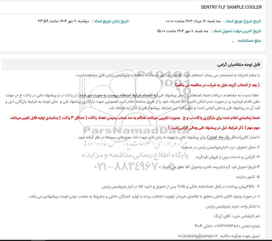 نحوه دریافت اسناد و ارسال پیشنهاد: متقاضیان میتوانند با ثبت نام در سامانه مناقصات و مزایدات ایران (پارس نماد) نسبت به مشاهده اسناد استعلام، دریافت اطلاعات تکمیلی، و ثبت پیشنهاد قیمت خود اقدام نمایند. در صورت نیاز به دریافت راهنمایی یا پشتیبانی در خصوص استعلام و مناقصه و فراخوان مناقصه عمومی، مناقصه محدود، مناقصه بین المللی، مناقصه دولتی، مناقصه خصوصی، مناقصه آنلاین فروش تجهیزات، مناقصه مشاورهای مناقصه پتروشیمی و انرژی مناقصه صنایع و تجهیزات برق و مخابرات و نفت و گاز ... لطفاً با سایت خبری مناقصه و مزایده پارسنماد دادهها به شماره 88349670 تماس حاصل فرمایید.