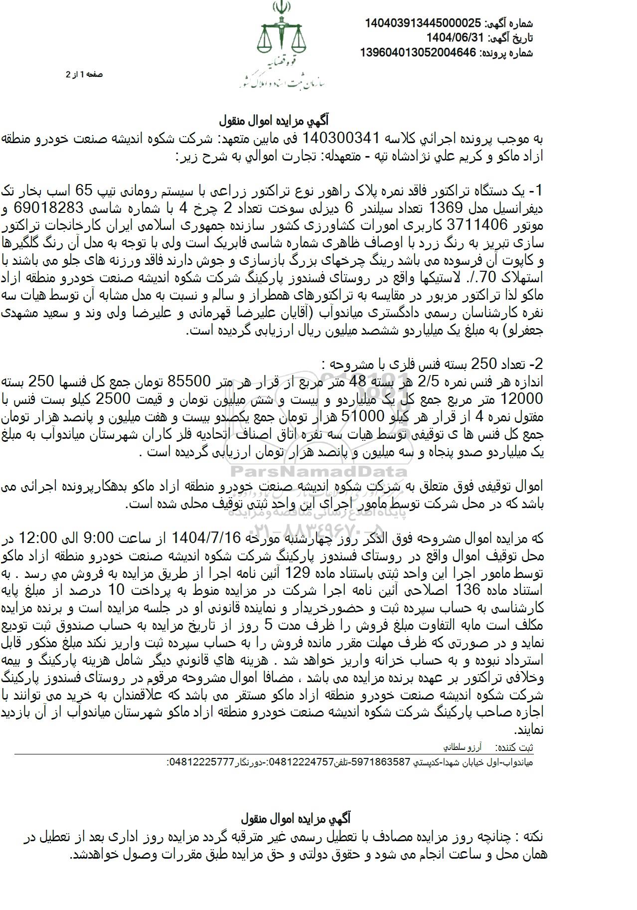که مزایده اموال مشروحه فوق الذکر روز چهارشنبه مورخه 1404.7.16 از ساعت 9:00 الی 12:00 در محل توقیف اموال واقع در روستای فسندوز پارکینگ شرکت شکوه اندیشه صنعت خودرو منطقه آزاد ماکو توسط مامور اجرا این واحد ثبتی باستناد ماده 129 آئین نامه اجرا از طریق مزایده به فروش می رسد . به استناد ماده 136 اصلاحی آئین نامه اجرا شرکت در مزایده منوط به پرداخت 10 درصد از مبلغ پایه کارشناسی به حساب سپرده ثبت و حضور خریدار و نماینده قانونی او در جلسه مزایده است و برنده مزایده مکلف است ما به التفاوت مبلغ فروش را ظرف مدت 5 روز از تاریخ مزایده به حساب صندوق ثبت تودیع نماید و در صورتی که ظرف مهلت مقرر مانده فروش را به حساب سپرده ثبت واریز نکند مبلغ مذکور قابل استرداد نبوده و به حساب خزانه واریز خواهد شد. هزینه های قانونی دیگر شامل هزینه پارکینگ و بیمه و خلافی تراکتور بر عهده برنده مزایده می باشد ، مضافا اموال مشروحه مرقوم در روستای فسندوز پارکینگ شرکت شکوه اندیشه صنعت خودرو منطقه آزاد ماکو مستقر می باشد که علاقمندان به خرید می توانند با اجازه صاحب پارکینگ شرکت شکوه اندیشه صنعت خودرو منطقه آزاد ماکو شهرستان میاندواب از آن بازدید نمایند.