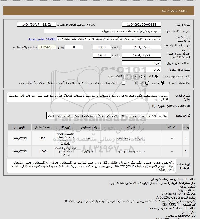 شرح کلی نیاز: سرب و سیم پلمپ