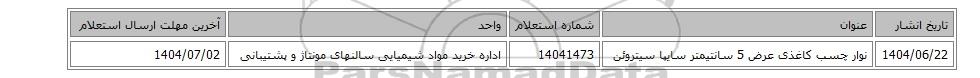 | 1404/06/22 | نوار چسب کاغذی عرض 5 سانتیمتر سایپا سیتروئن | 14041473 | اداره خرید مواد شیمیایی سالنهای مونتاژ و پشتیبانی | 1404/07/02 |