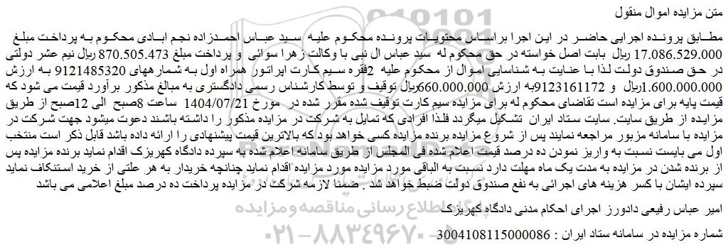 مطابق پرونده اجرایی حاضر در این اجرا براساس محتویات پرونده محکوم علیه  سید عباس احمدزاده نجم ابادی محکوم به پرداخت مبلغ   17.086.529.000 ریال  بابت اصل خواسته در حق محکوم له  سید عباس ال نبی با وکالت زهرا سوائی  و پرداخت مبلغ 870.505.473 ریال نیم عشر دولتی در حق صندوق دولت لذا با عنایت به شناسایی اموال از محکوم علیه  2فقره سیم کارت اپراتور همراه اول به شمارههای 9121485320 به ارزش 1.600.000.000ریال  و 9123161172به ارزش 660.000.000ریال توقیف و توسط کارشناس رسمی دادگستری به مبالغ مذکور برآورد قیمت می شود که قیمت پایه برای مزایده است تقاضای محکوم له برای مزایده سیم کارت توقیف شده مقرر شده در  مورخ 1404/07/21  ساعت 8صبح  الی 12صبح از طریق مزایده از طریق سایت. سایت ستاد ایران  تشکیل میگردد فلذا افرادی که تمایل به شرکت در مزایده مذکور را داشته باشند دعوت میشود جهت شرکت در مزایده با سامانه مزبور مراجعه نمایند پس از شروع مزایده برنده مزایده کسی خواهد بود که بالاترین قیمت پیشنهادی را ارائه داده باشد قابل ذکر است منتخب اول می بایست نسبت به واریز نمودن ده درصد قیمت اعلام شده فی المجلس از طریق سامانه اعلام شده به سپرده دادگاه کهریزک اقدام نماید برنده مزایده پس از برنده شدن در مزایده به مدت یک ماه مهلت دارد نسبت به الباقی مورد مزایده مورد مزایده اقدام نماید چنانچه خریدار به هر علتی از خرید استنکاف نماید سپرده ایشان با کسر هزینه های اجرائی به نفع صندوق دولت ضبط خواهد شد . ضمنا لازمه شرکت در مزایده پرداخت ده درصد مبلغ اعلامی می باشد